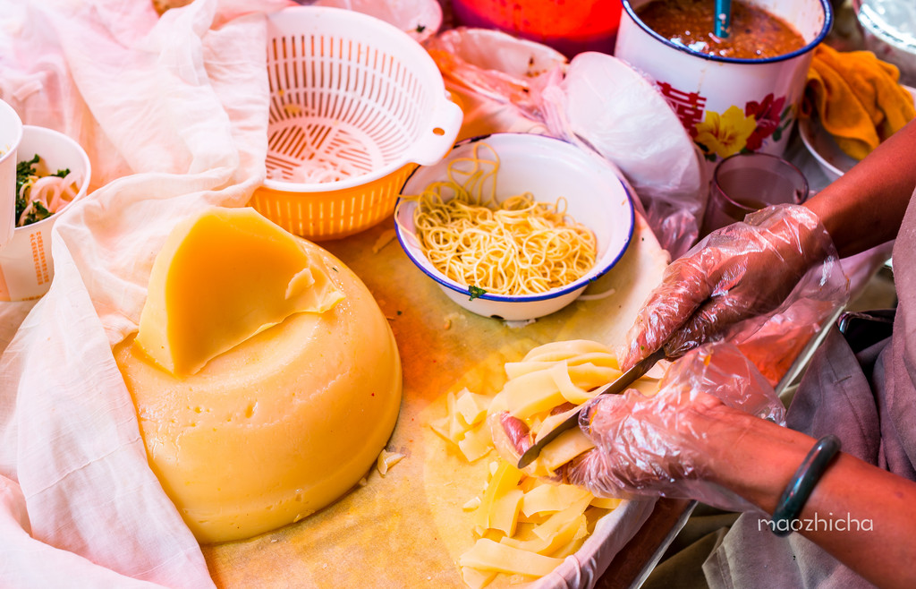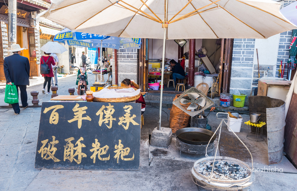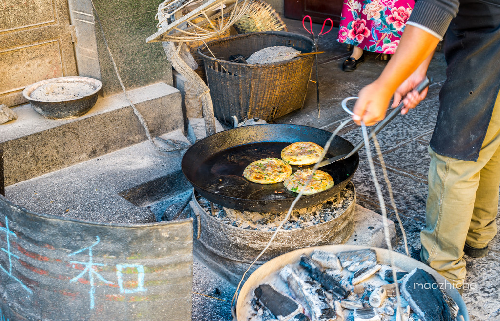 喜洲粑粑可以说是喜洲的最大代言“人”了,来到这里一定要吃一个,虽然卖相一般,但制作工艺还是很讲究的,制时皆用上下两层炭火,上层炭火为猛火,下层炭火为文火,在做好的面胚上刷上猪油之后入锅烘焙,在烤制过程中繁复刷几次油脂,烤香直至烤酥。喜洲粑粑外皮香酥而内在绵软,所以会看到在喜洲古镇中,每家店都是写的“破酥粑粑”,一口下去,酥脆的外皮下满满的花香,实在是太好吃了。