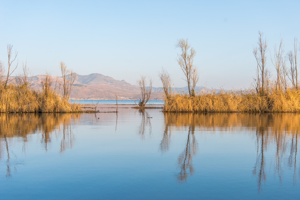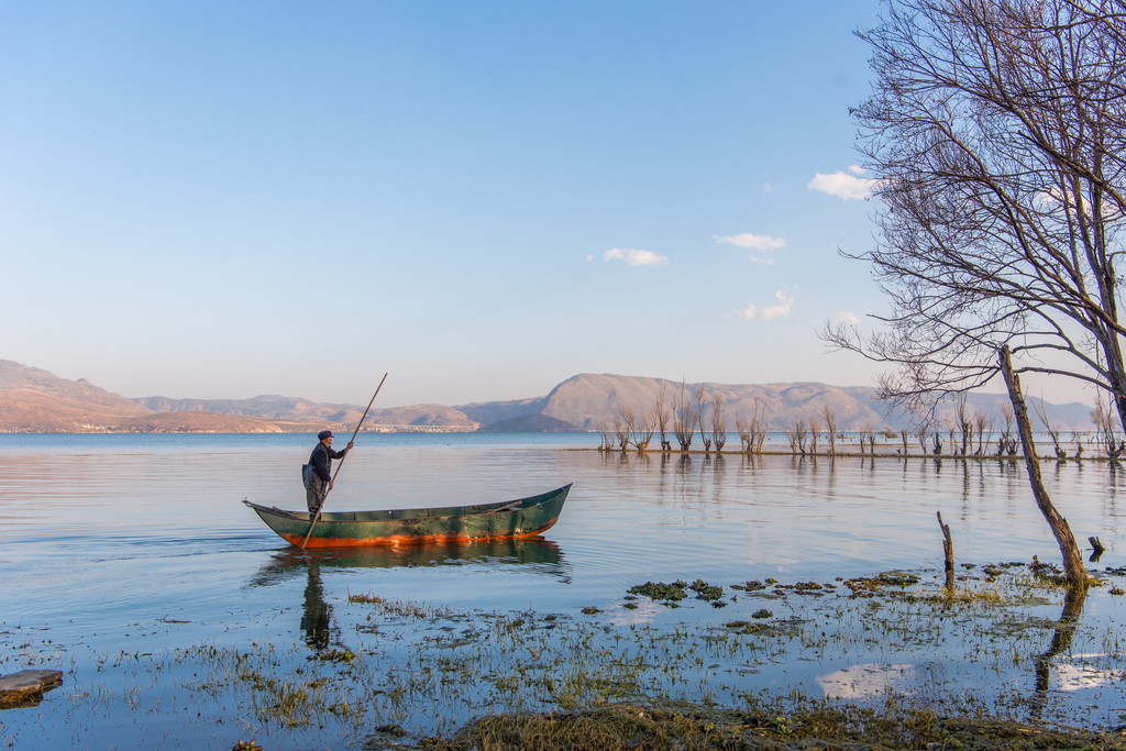 一边靠洱海,蓝天、白云、树林、湿地、渔船……各种元素绘成一幅绝美的山水风光,让人流连忘返。