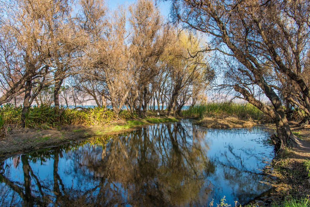 越往公园深处走,感觉风越大,尽头的这颗树被风吹的感觉要倒了,突然很想知道那著名的上关风比这里还要厉害多少,但是小朋友似乎没有被大风影响到,在海边寻找着某些海中的小生物。