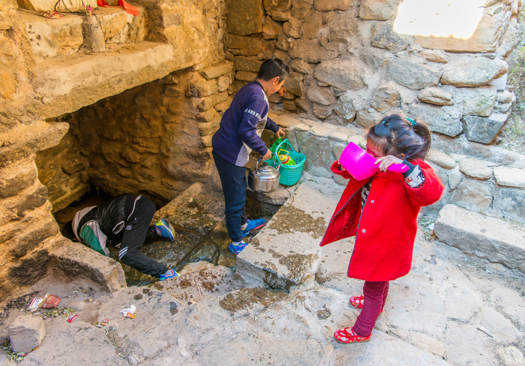 在村里闲逛时,碰到了三个小朋友,得知他们要去观音井打水,就兴趣盎然的跟着他们一起来了。观音井在路旁一个非常不明显的石梯下面,一个不算太大的长方形井口,进口上方有一座观音石像,故名“观音井”,村民饮水都从这里取用,井水没有被污染,可以直接饮用,小妹妹渴得一到井边就先咕噜咕噜豪饮的半勺。