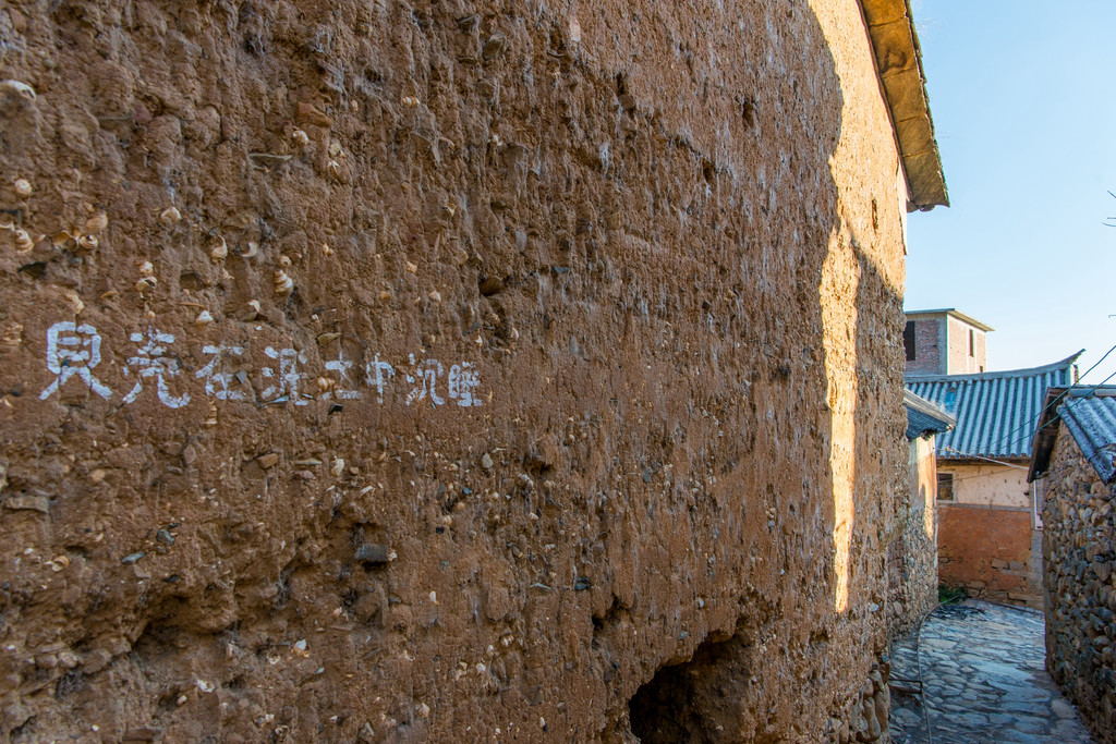 路边一座似乎已经荒废的房子上有一面的贝壳墙,贝壳墙顾名思义就是把贝壳和泥土混合后夯打而成的墙,这种墙更结实、更牢固,而且墙体强,不易裂,这种贝壳墙在沿河或者沿湖周边的居民经常使用,就地取材而且独具特色。