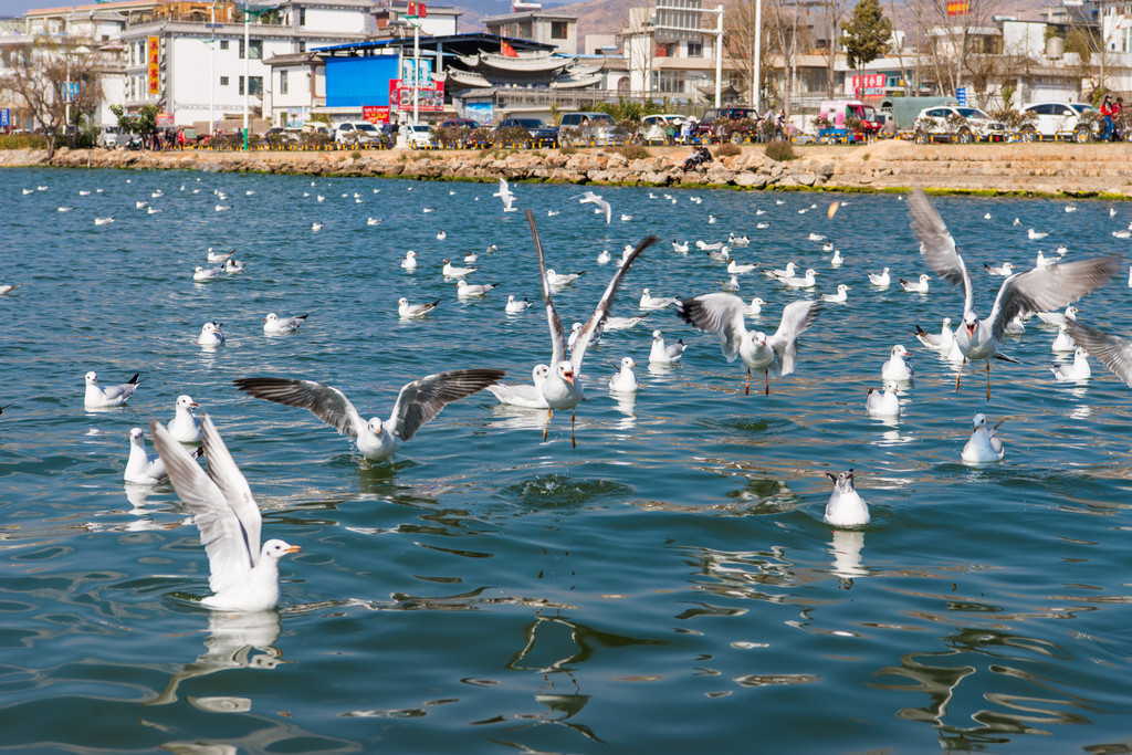 海鸥从每年的11月份来到这里,到第二年的3月初离开,挖色镇的海鸥主要集中在镇口和小普陀附近,它们似乎已经习惯了游人们的争相喂养,吃的不亦乐乎,漫天都是它们欢快的叫声,感染了周围的人们,心情马上也变得明亮起来。
