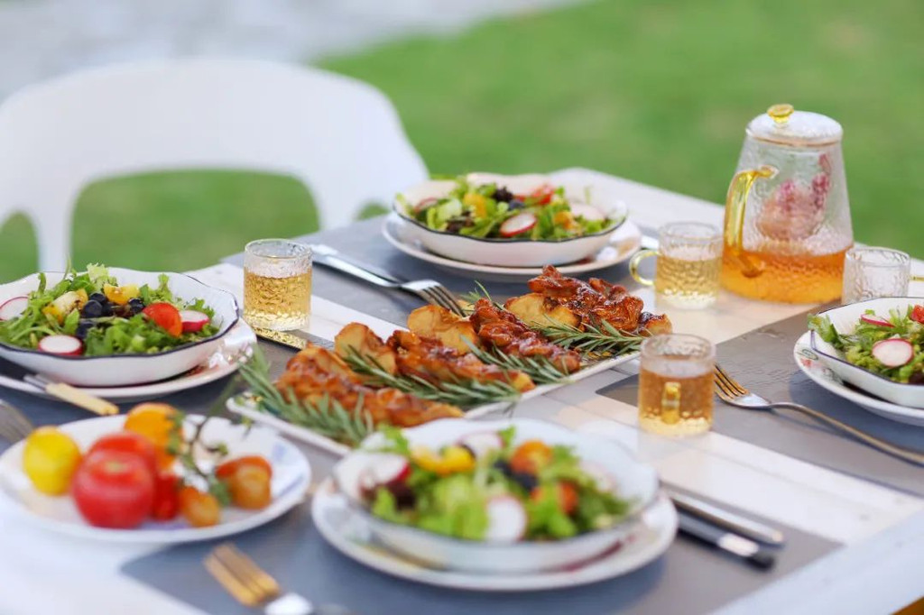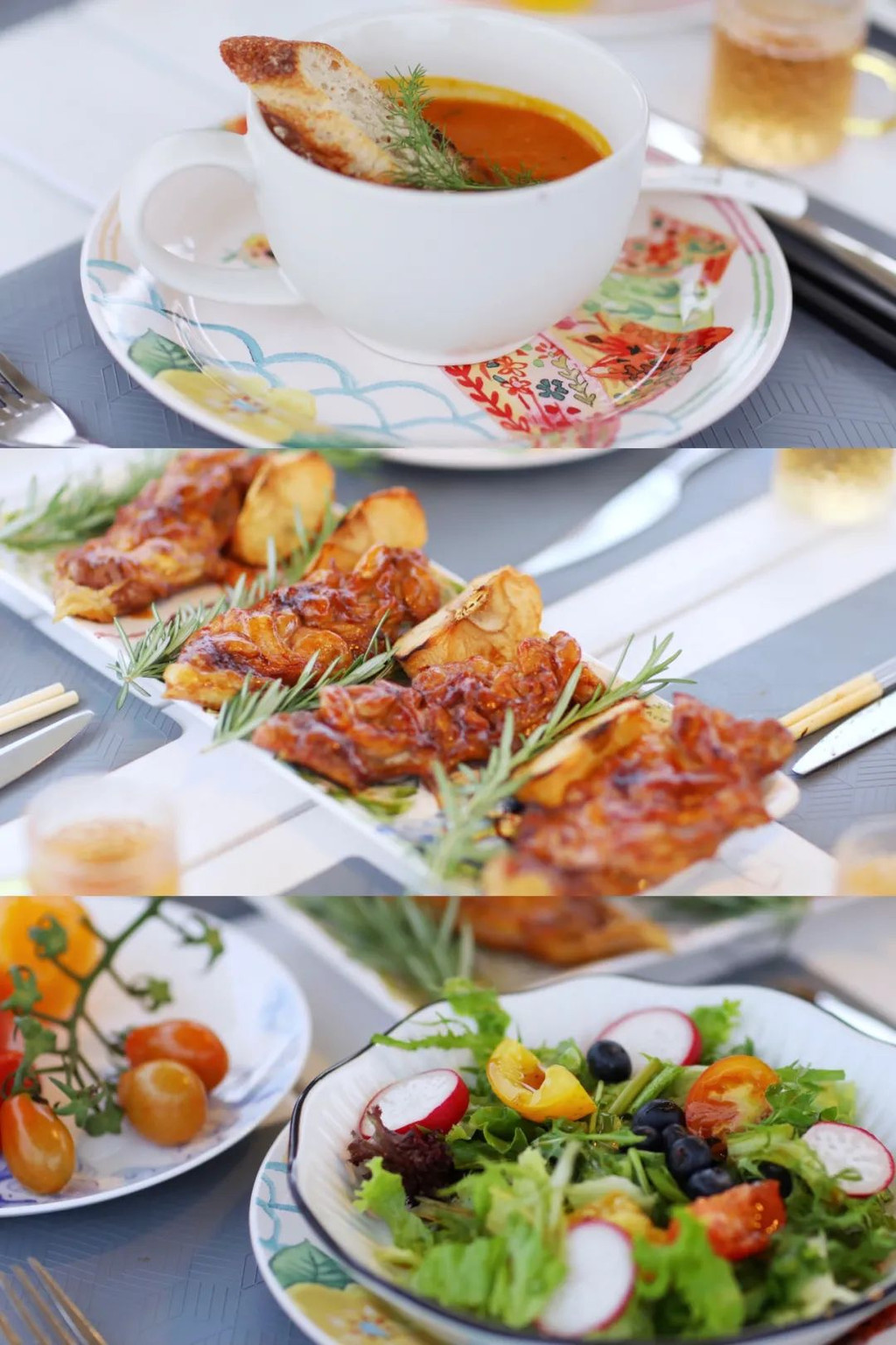 只要不下大雨,都可以在花园里就餐。入座后有花茶和水果,菜是一道道上的,很有仪式感。