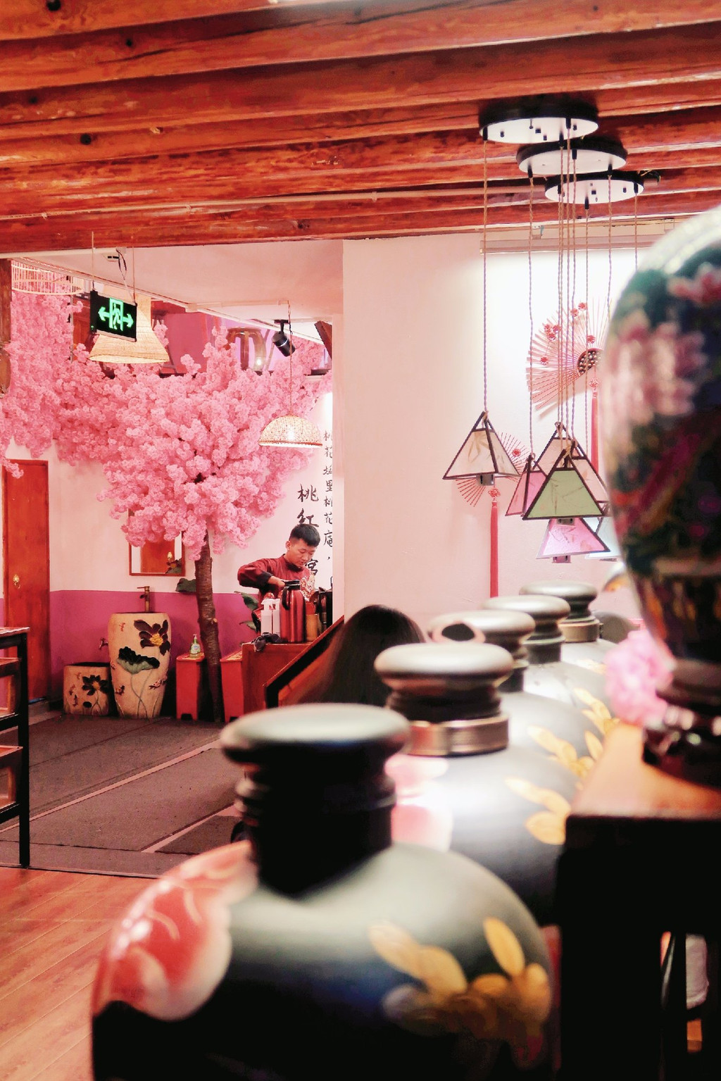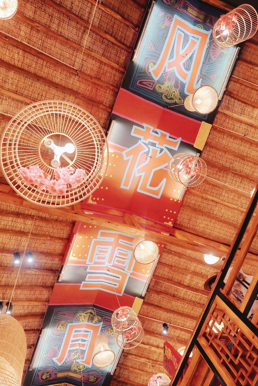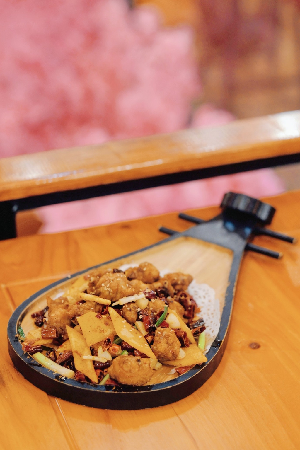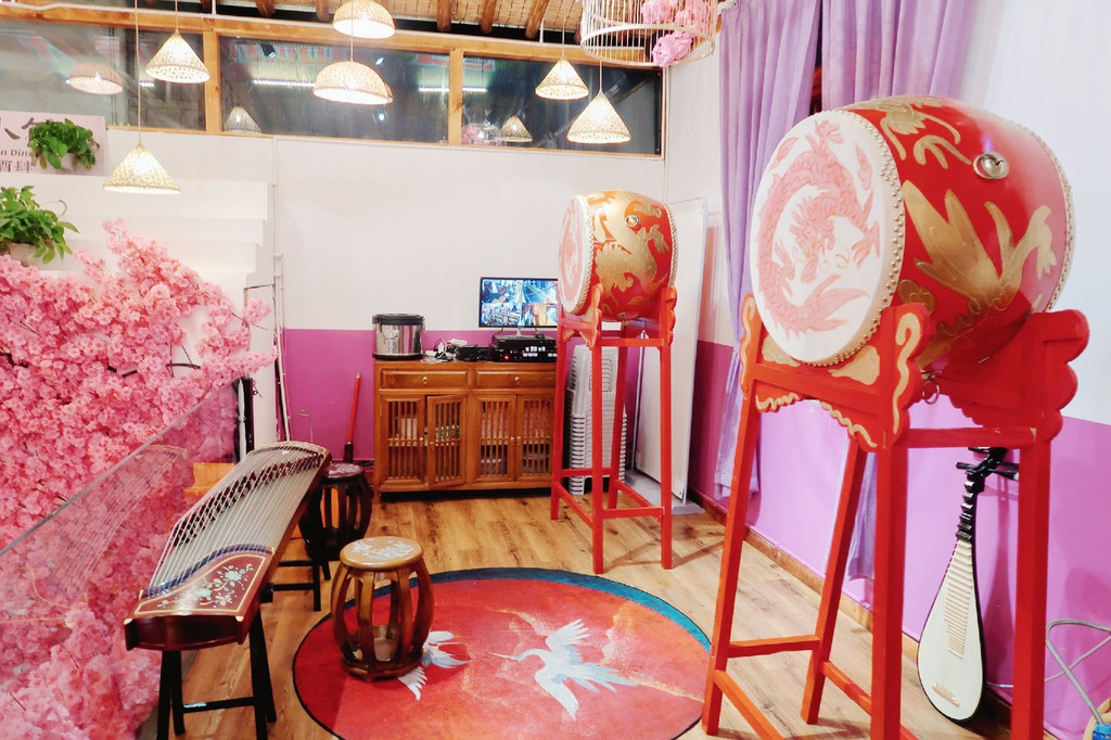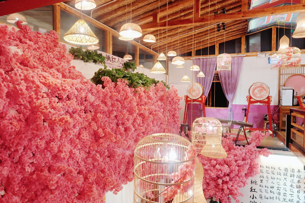 餐厅非常古风古味,樱花装饰的门面、菜谱密奏、木制楼阁、纸糊灯笼、古筝锣鼓,真是太古风了,穿着汉服来拍更美,一秒穿越古代~