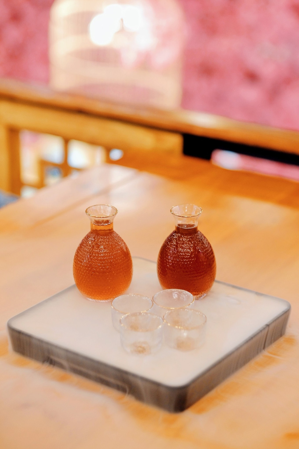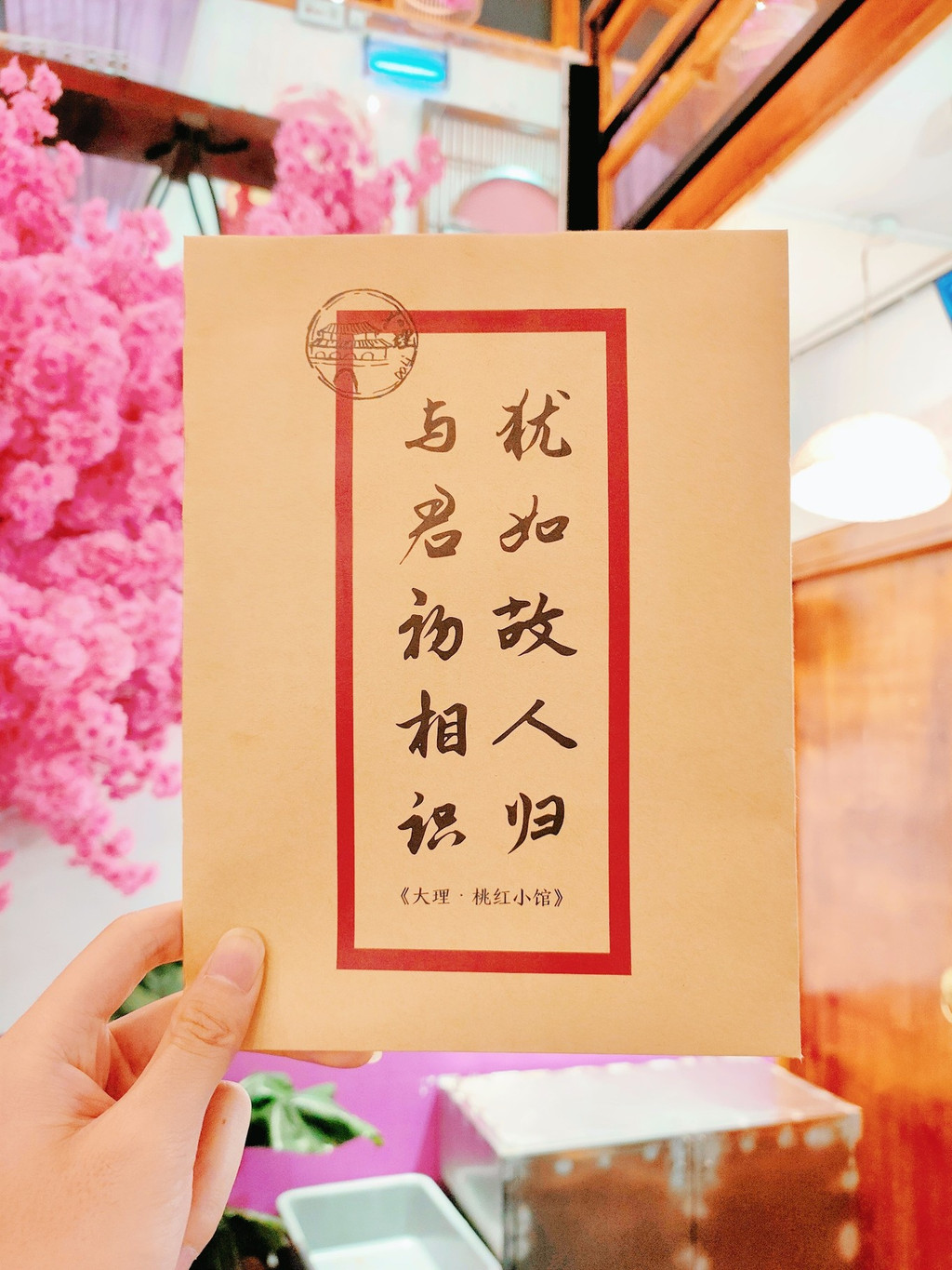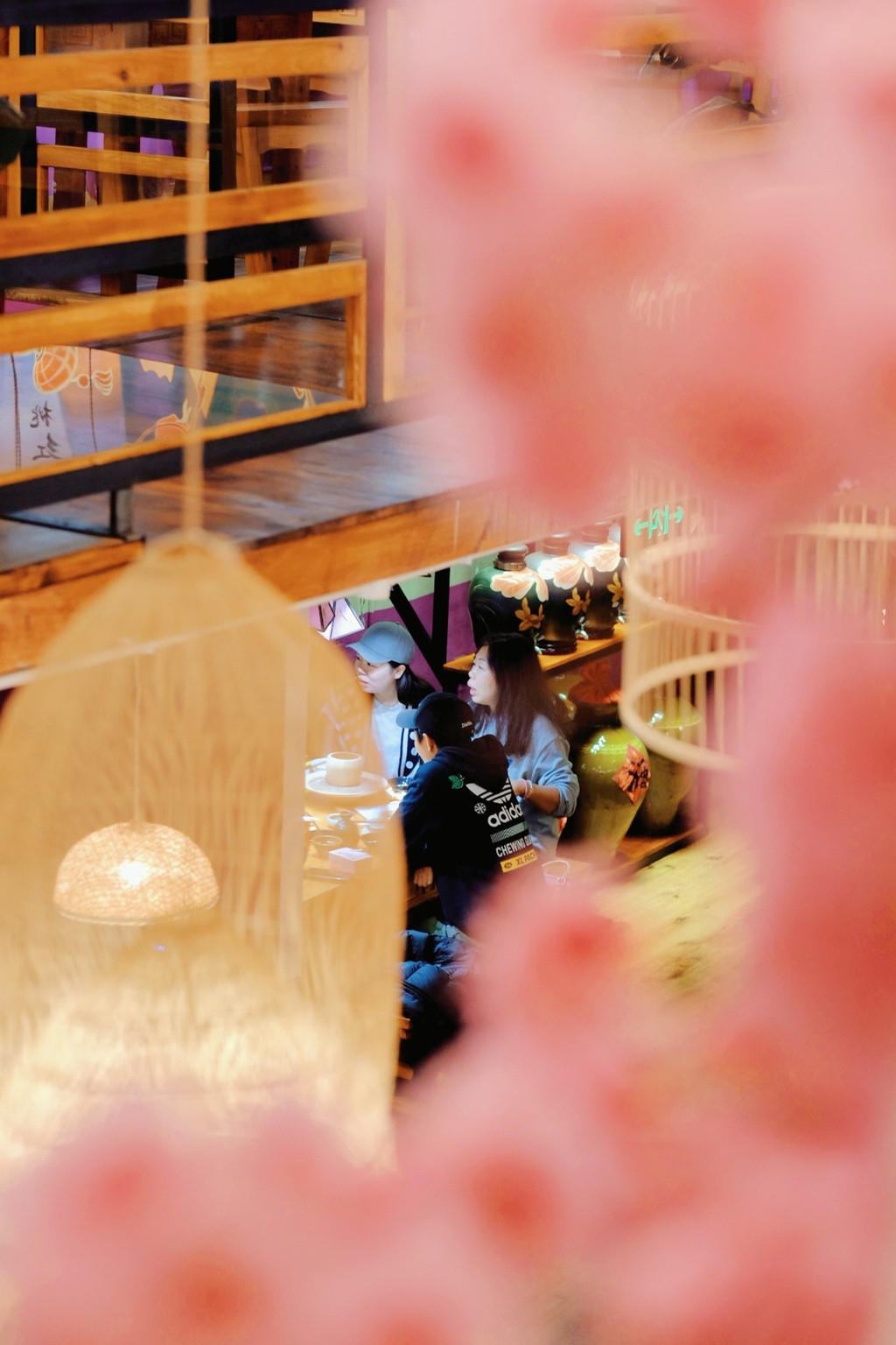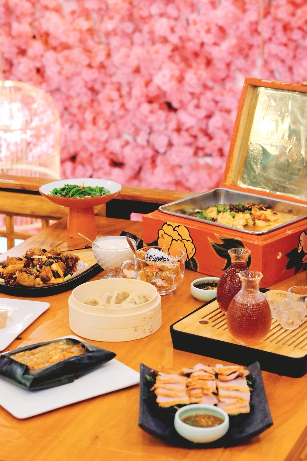 餐厅非常古风古味,樱花装饰的门面、菜谱密奏、木制楼阁、纸糊灯笼、古筝锣鼓,真是太古风了,穿着汉服来拍更美,一秒穿越古代~