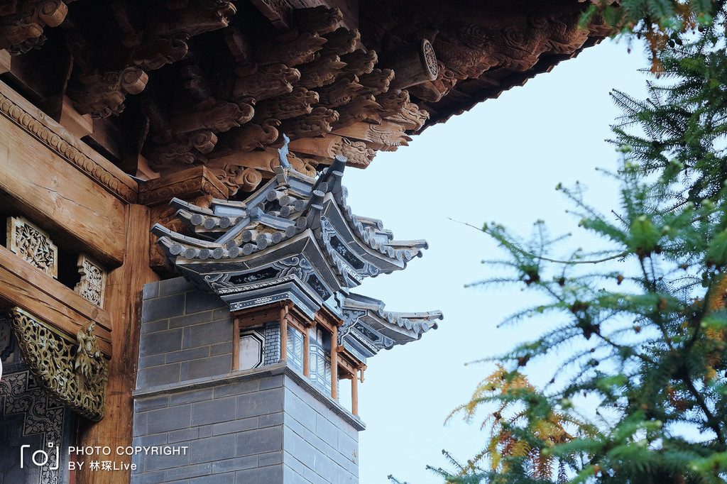 这座有鲜明白族风格的教堂叫圣三堂,中式角高高翘起,像是一对张开的翅膀,飞起的屋檐下是精美的石雕和艳丽的彩绘,非常好看。