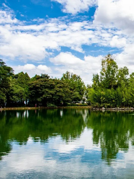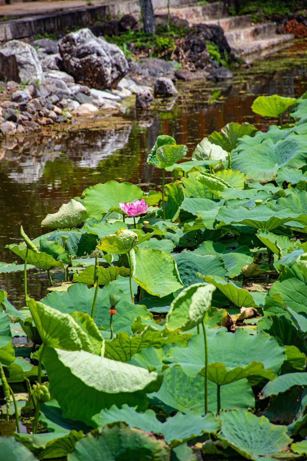 在南诏风情岛看水天相接,岛上的山、树、石连成美景,烟霞璀璨,石头小路和亭台楼阁蜿蜒曲折,古树树影婆娑,感受清风拂面的轻柔感。