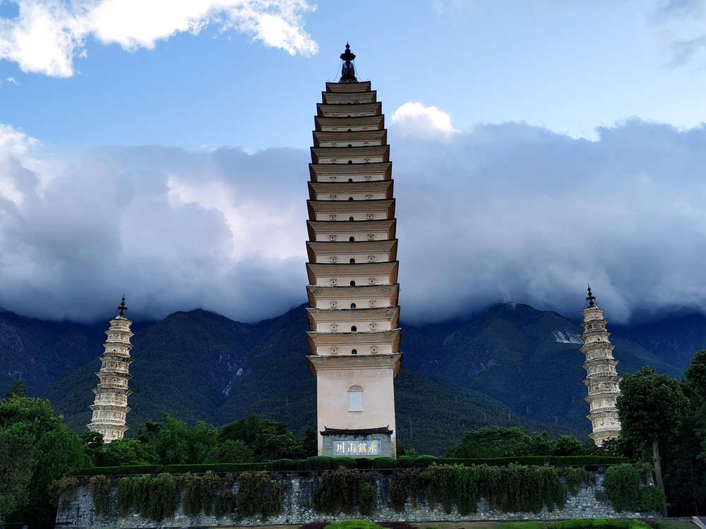 崇圣寺三塔是大理的标志。主塔16层称千寻塔。一大二小拱卫而立。它是千年古市崇圣寺的符号。西背苍山,东临洱海。端庄傲立、秀丽遒劲。不但是千年历史的体现。更有西南佛国的神秘。