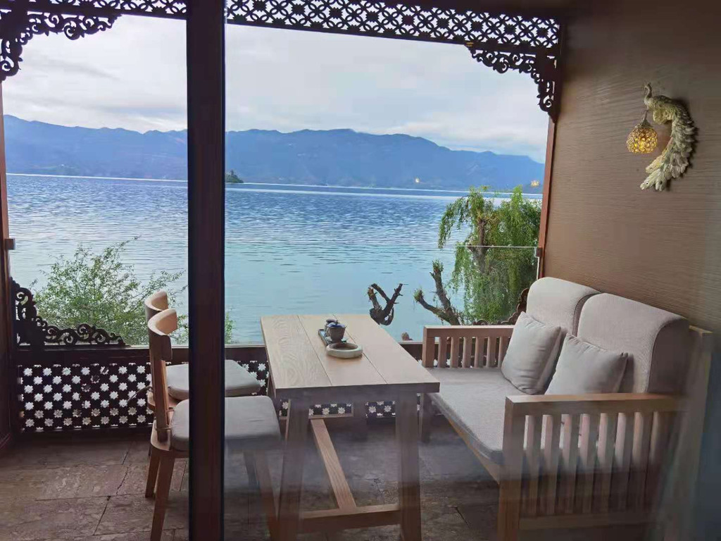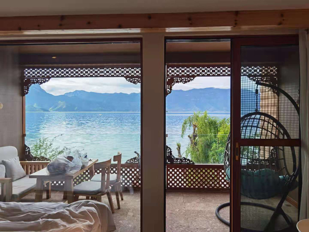 15:00入住泸沽湖大落水村的悦莲庄达布墅院 客栈,我们定了湖景露台房+湖景露台套房,面积都在50平以上(泸沽湖多数临湖的客栈住宿面积较小,30平左右),且位置绝佳,门口一条人行小路之隔就是湖,坐在露台吹风特别棒,且房间的窗帘是电动的,早起躺在床上打开电动窗帘,懒洋洋看湖景赞的不得了。