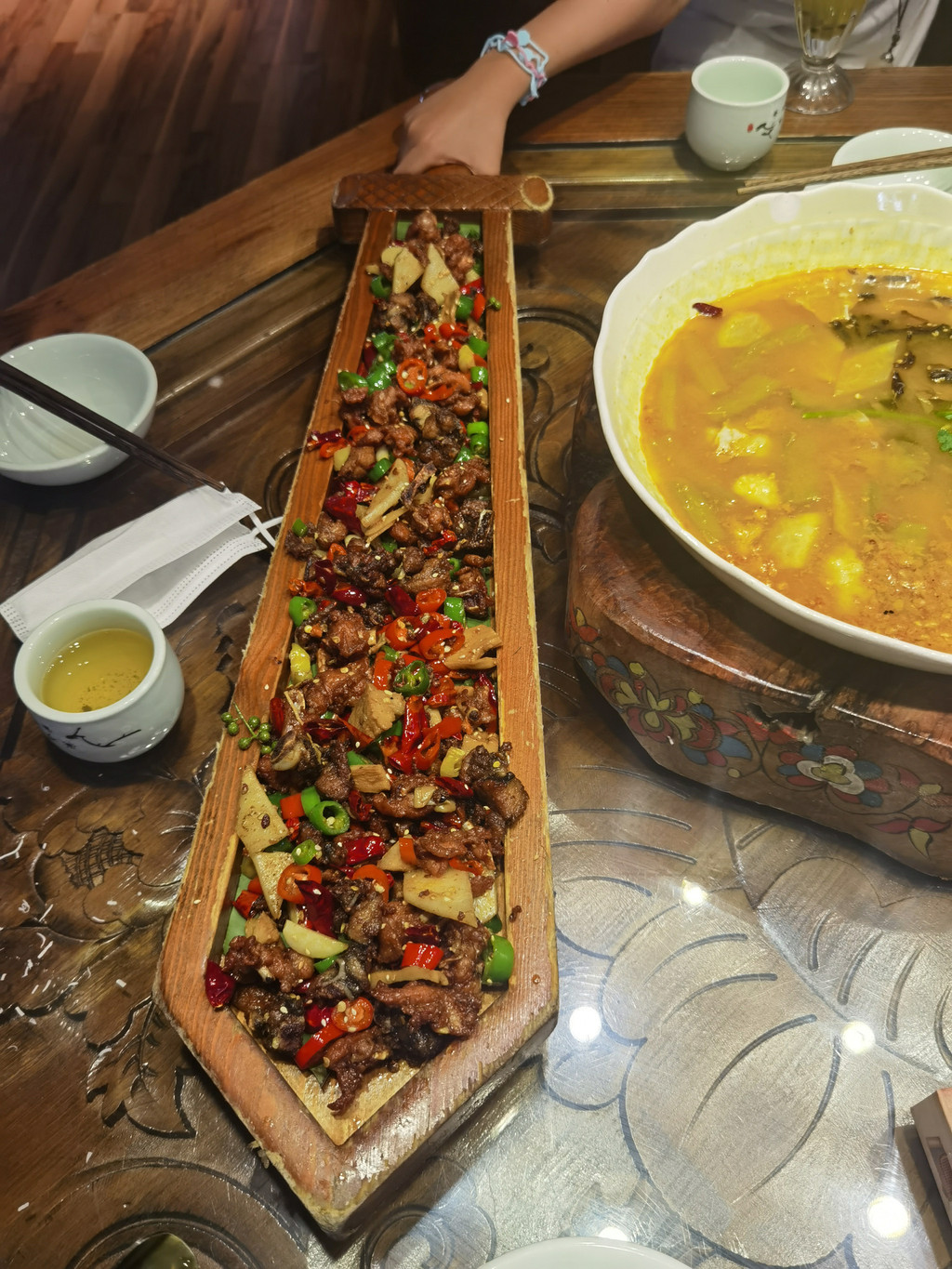 13:30到达大落水村,因为朋友建议+之前看攻略容易腹泻,本计划泸沽湖两天都面包自嗨锅到底。还是没忍住诱惑,在司机带领下,去吃了当地特色的柴火地锅鸡,非常美味,事实证明确实也没拉肚子。
