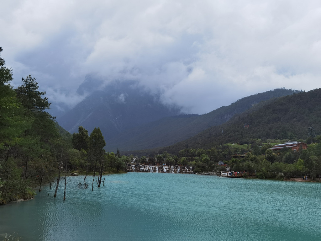10:30 包车去蓝月谷,包车为逸舍客栈老板帮忙订车,车程40分钟;蓝月谷位于玉龙雪山景区,考虑两家人实际情况,放弃玉龙雪山。但凡进入玉龙雪山景区的任何景点,不管是否去玉龙雪山,均需付进山门票成人100元,8岁以上儿童半价,8岁下免费。若跟团,除进山门票外每人还需额外付古城维修费50元。蓝月谷这个景点免费,若去玉龙雪山需另买索道登山票。包车只能到玉龙雪山景区停车场。景区内交通包括巴士车和电瓶车,巴士从停车场到景点,不管成人儿童每人20元,电瓶车可以绕蓝月谷兜一圈,人均50,因为步行蓝月谷一圈也就最多2小时,觉得电瓶车不太必要,所以我们选择了景区停车场到蓝月谷的大巴。当天到景区停车场后山上风雨交加,长袖T恤+长裤+防晒衣仍觉得冷飕飕,于是在停车场旁的超市每人买了一件长雨衣防雨防寒,每件20元,穿上确实暖和多了。巴士乘到第二站水月阁下车就是蓝月谷,美不胜收,随手都是大片儿。玩的有点嗨,返程已经下午3点多了,原计划看“印象丽江”演出已来不及,仅返程在景区停车场听到震撼的演出鼓声(这个演出位于玉龙雪山景区停车场附近)。