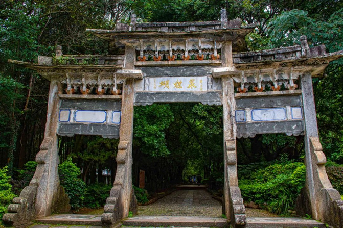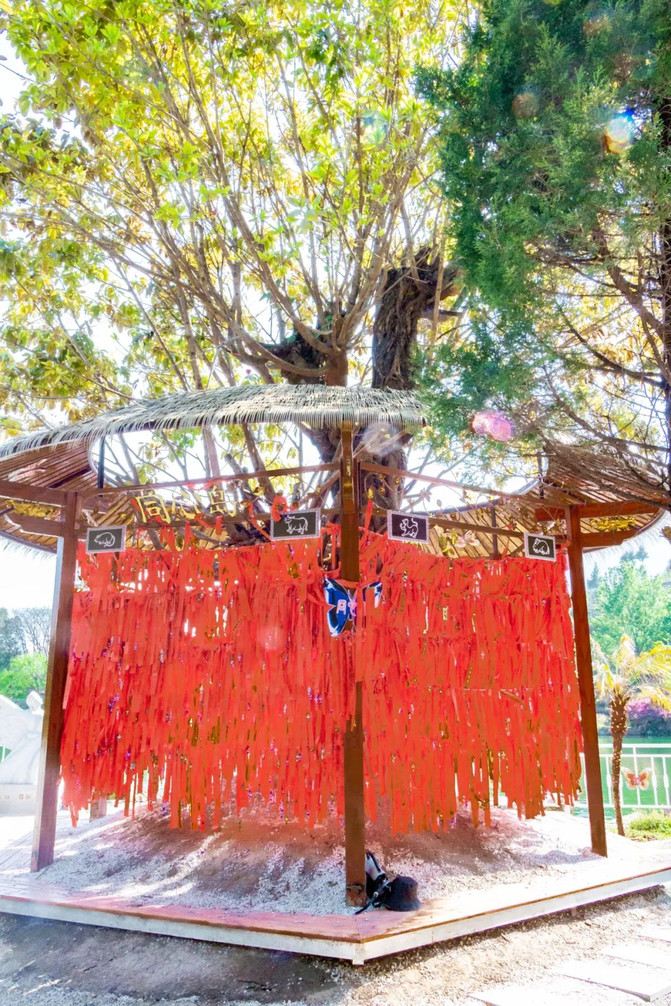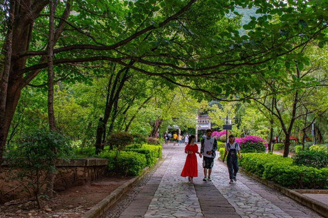 在蝴蝶泉不乏百年古树,从蝴蝶泉边的合欢树,到情人湖边的树林,再到游道两边的竹林,这里的建筑都被树木包裹其中,与环境融为一体,汇成为绿海。