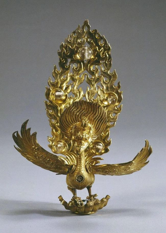 宋代大理国银鎏金嵌珠金翅鸟全身金黄色,头部像老鹰,爪牙锋利,眼睛怒目圆睁,头顶有羽冠,翅膀展开,尾部似一团直立燃烧的火焰,上面镶嵌透明的水晶珠,整个立像线条流畅,造型新颖、独特,从细节处就能看出高超的制作技艺。