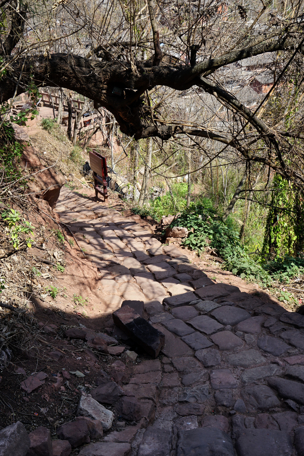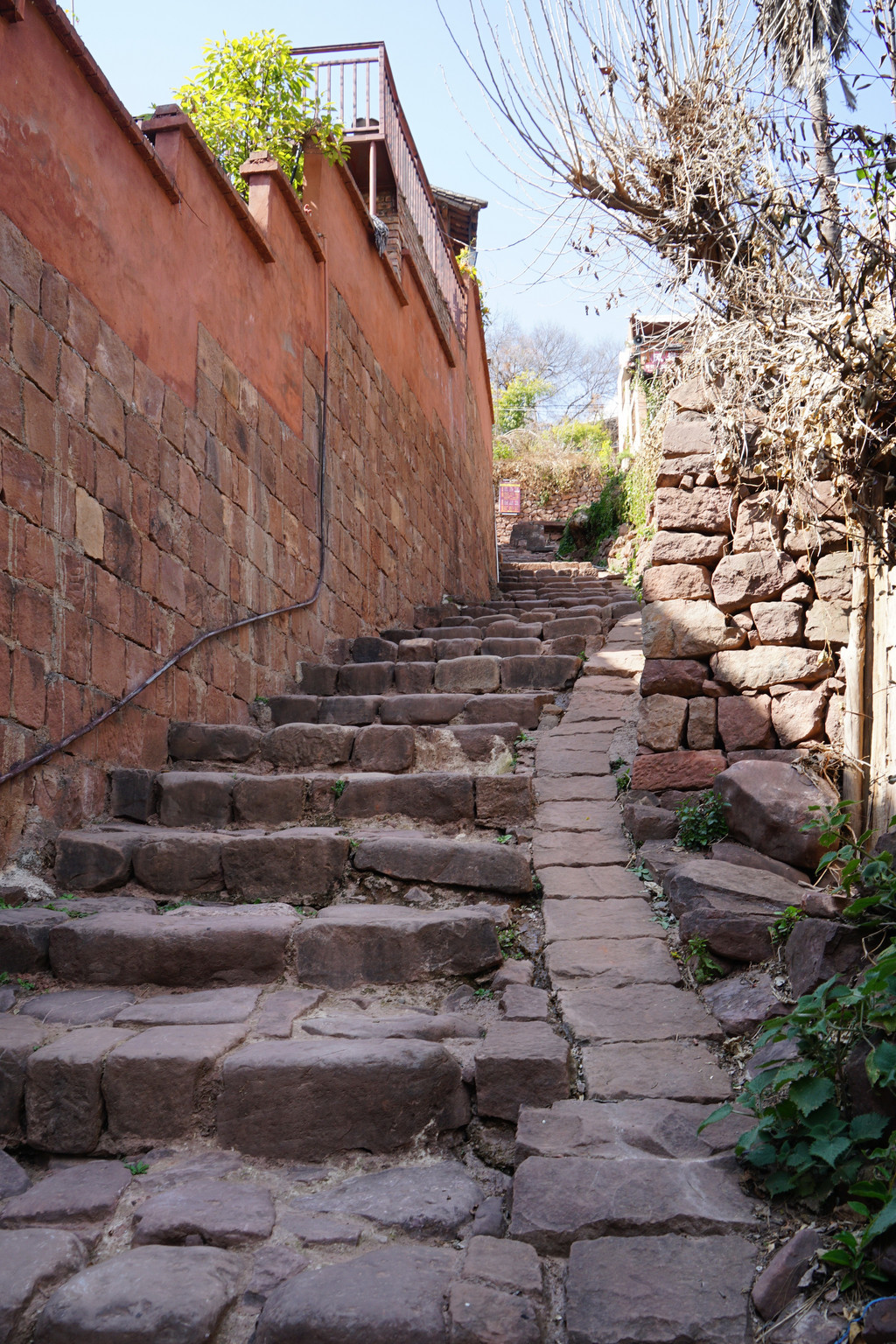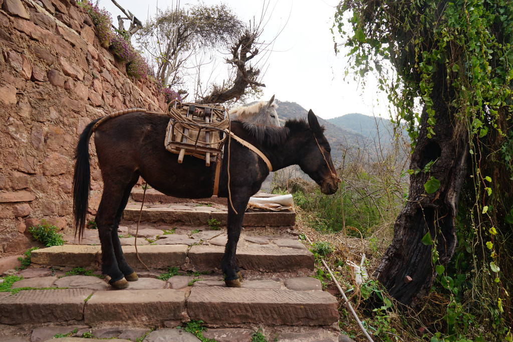 石阶大多不是平整的条石,而是一块块原生态石头铺就,呈凹凸不平状,原来当年是特意铺成这样,方便骡马走道防止蹄子打滑。