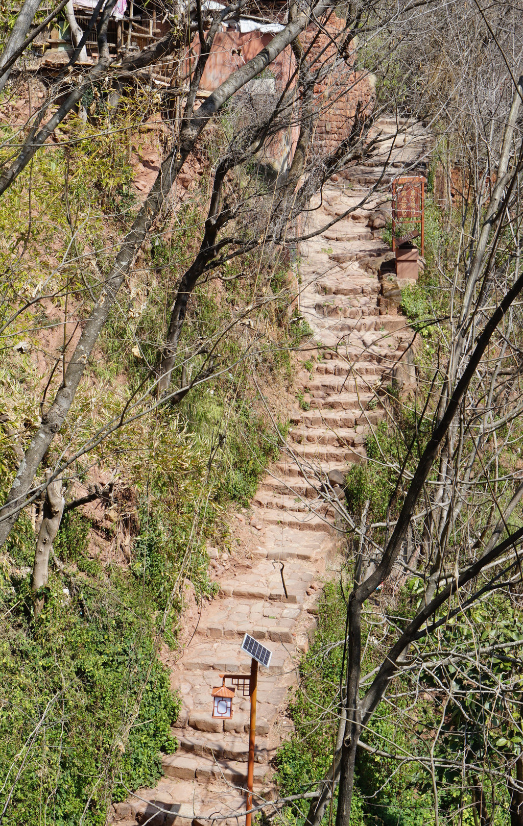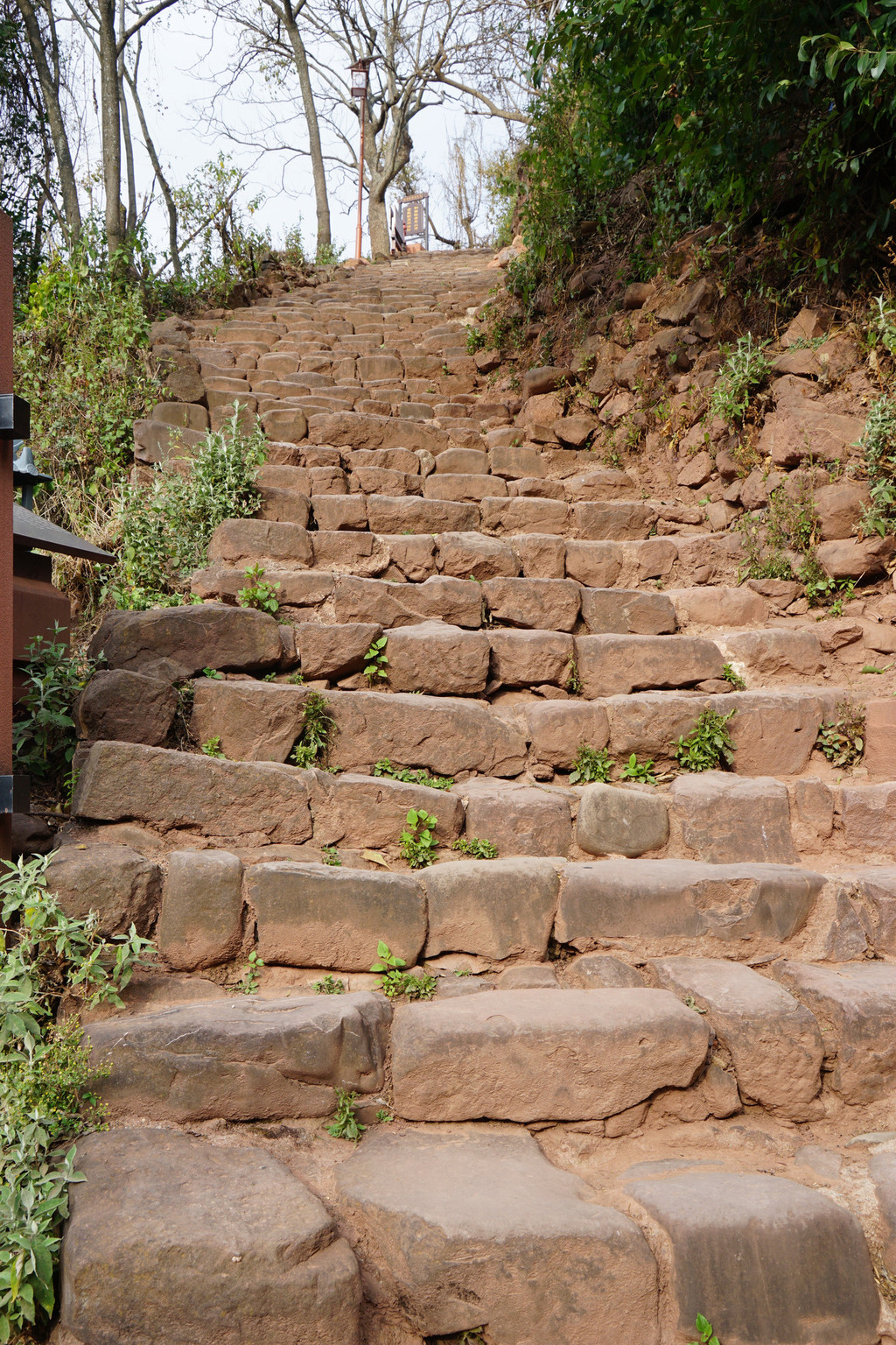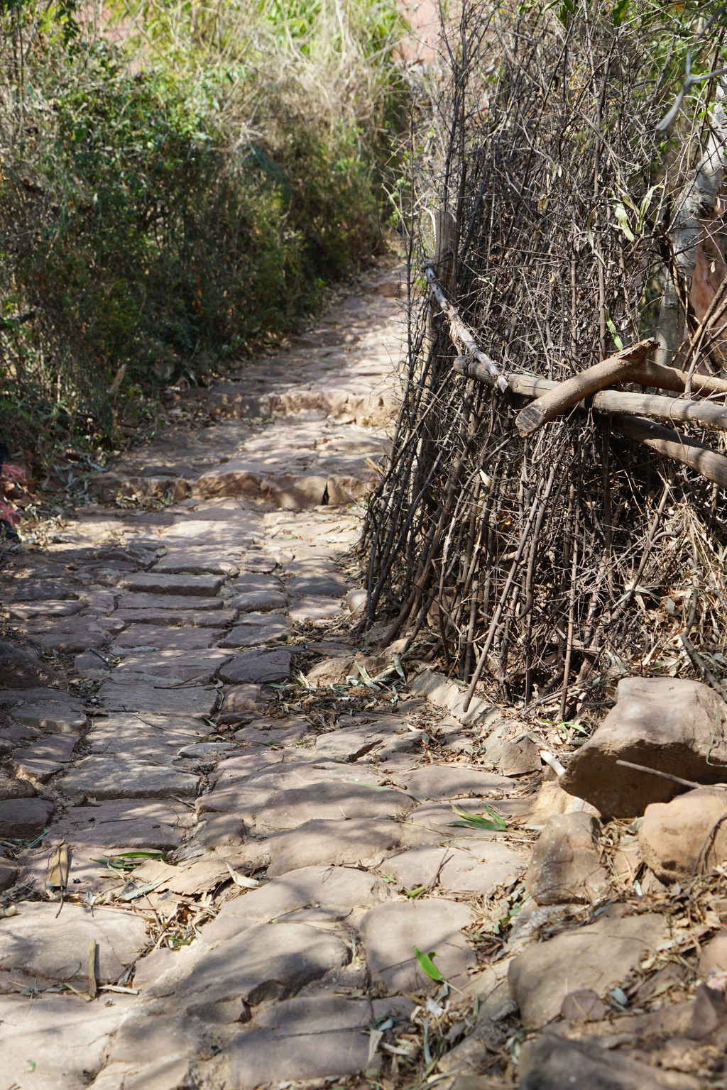 石阶大多不是平整的条石,而是一块块原生态石头铺就,呈凹凸不平状,原来当年是特意铺成这样,方便骡马走道防止蹄子打滑。