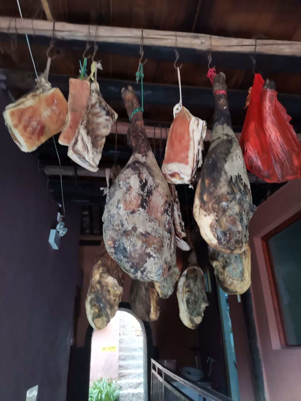 朋友在微信上说沒见到火腿。询问村民,已经过了腌制季节,现家家戸户挂着的几只火腿,都是揽客商品,一百元一斤。