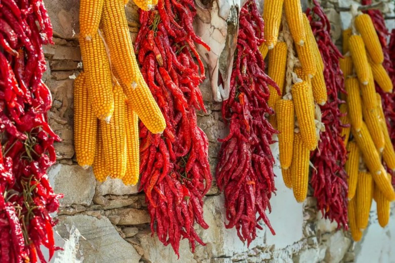 宽广平坦的大院平地常常变换色彩。金色的是小麦,红色的是辣椒,米白的是大豆。在阳光下蒸腾着生活的朝气。