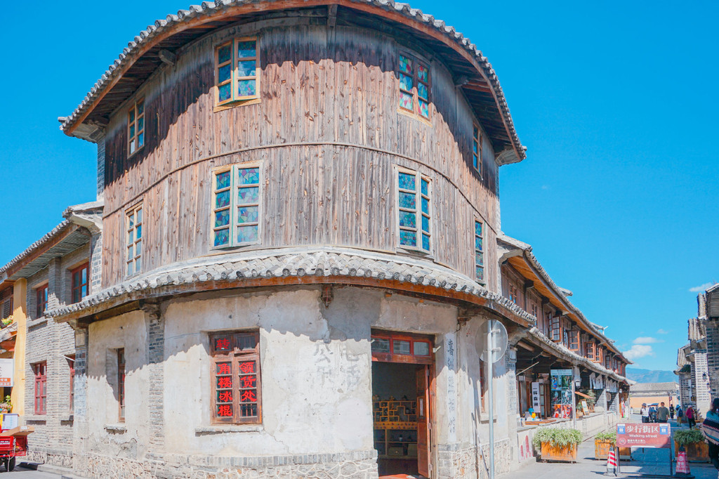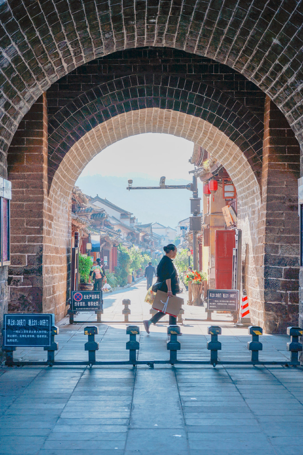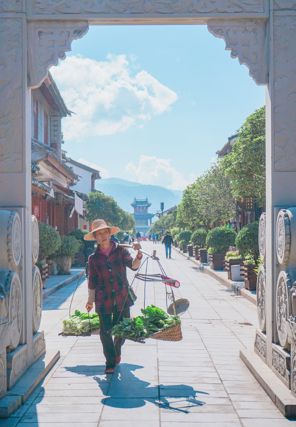 转角楼这是标志性建筑圆角楼,只要来喜洲的人都会来这里打卡,四方街是喜洲镇的中心,也是最热闹的地方,脚下是青砖铺成的小路,房屋墙体大多都掉了皮,露出泛黄的土坯,屋顶长满荒草,木门也都褪色陈旧,岁月总是留下痕迹,让后人寻觅,偶尔会有一两位身穿民族传统服饰的老人推开陈旧的木门走出来,目光平静或满面笑容的看着你,那感觉,就如同包裹着古镇的温暖阳光。