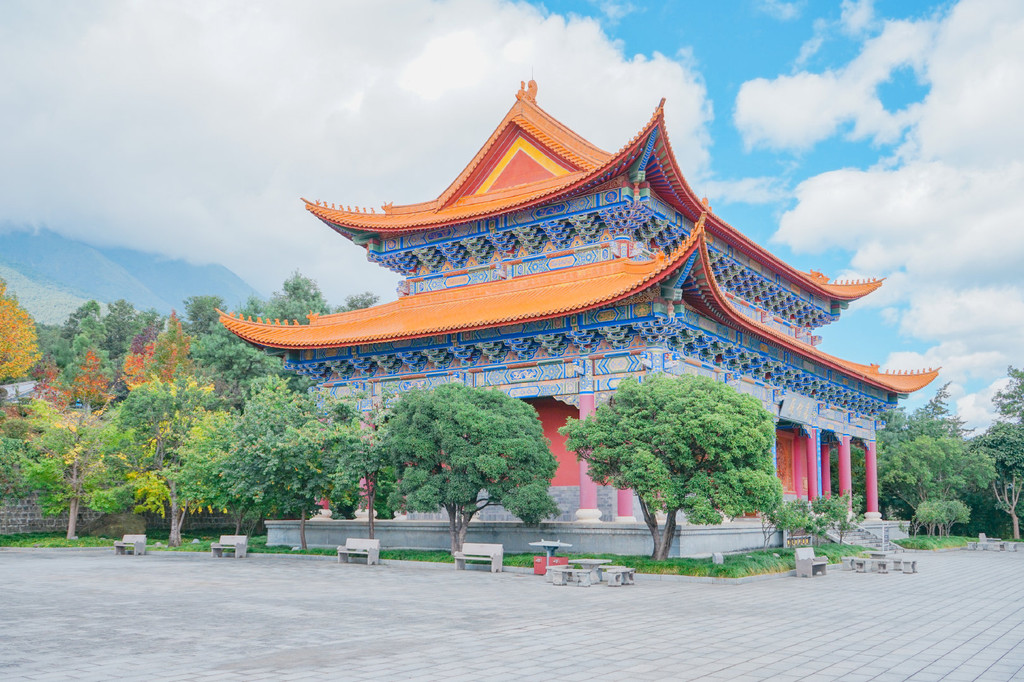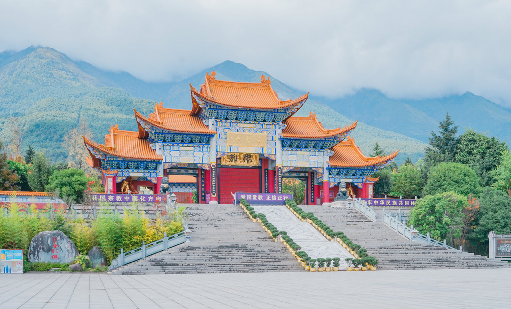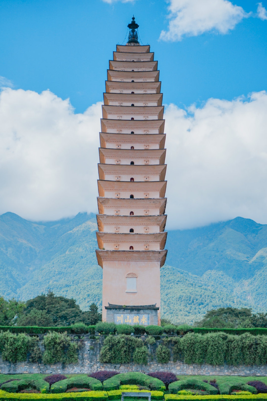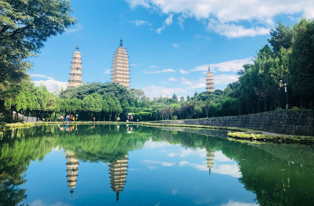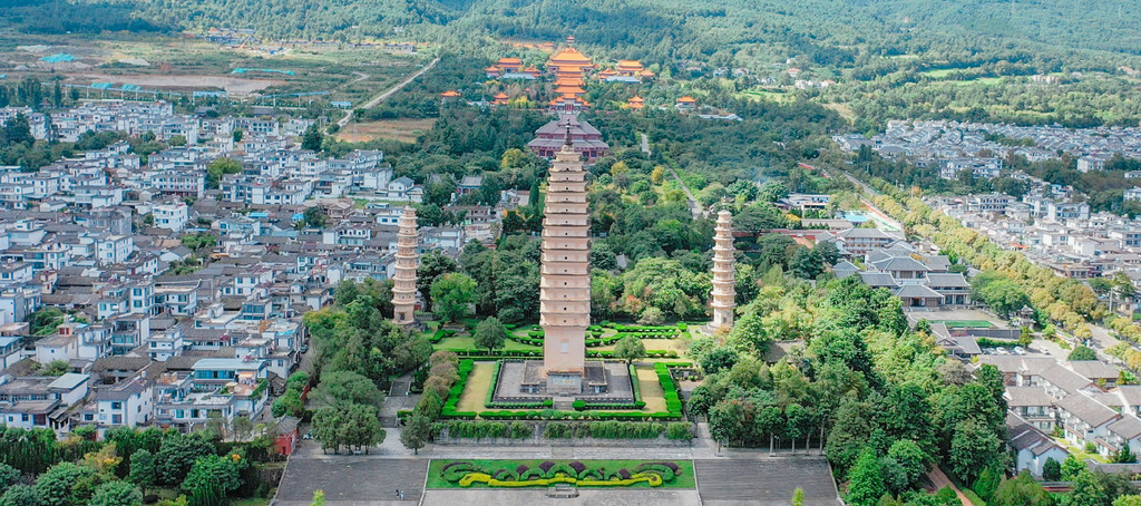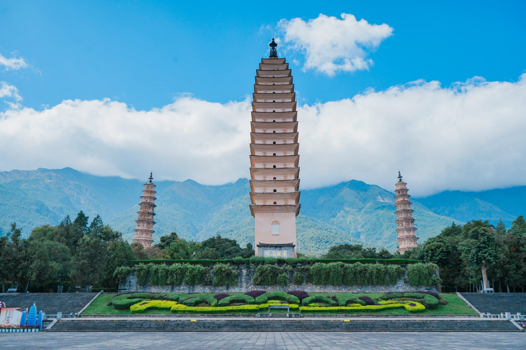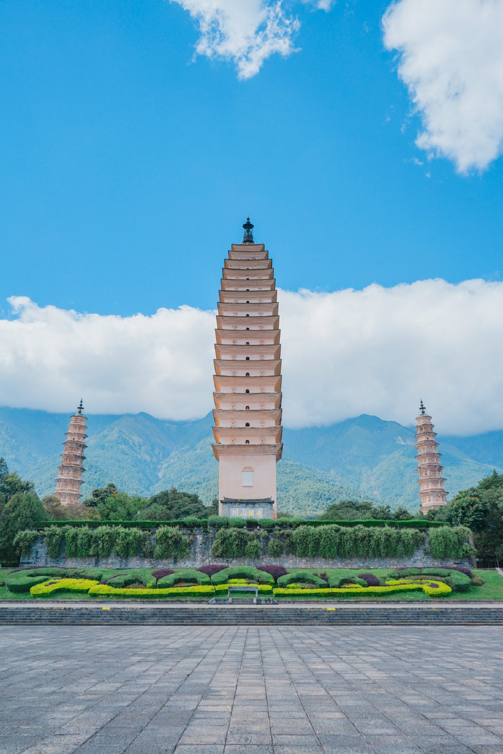 双脚踏入景区大门,稍抬头,映入眼帘的是青翠的树木,一幅生机勃勃的样子。正中间就是一条笔直宽敞的景观大道,放眼望去,不远处,就是三塔广场。崇圣寺三塔寺是南诏国后期,南诏国第十代王劝丰佑修建的一座寺庙。刚开始,南诏国先是建了方形密檐式的大塔“千寻塔”,之后又建了八角形的南、北小塔。那么为什么要修这三座塔呢?你一定会说是为了宣传佛教,但是除此之外还有一个重要的原因。古时候的大理是“泽国多水患”,古籍《金石萃编》里面就有一段这样的记载:“世传龙性敬塔而畏鹏,大理旧为龙泽,故为此镇之。”因此,就修建了三塔。