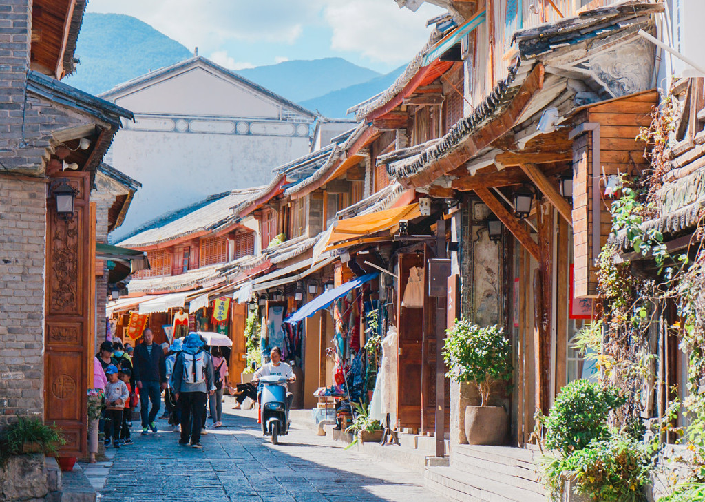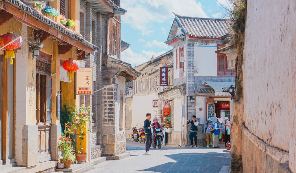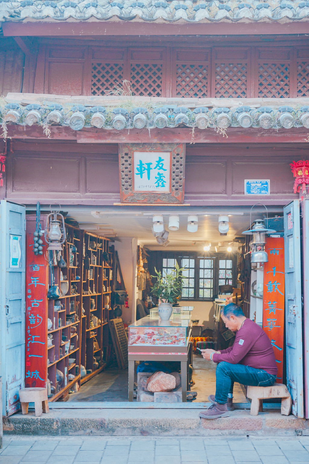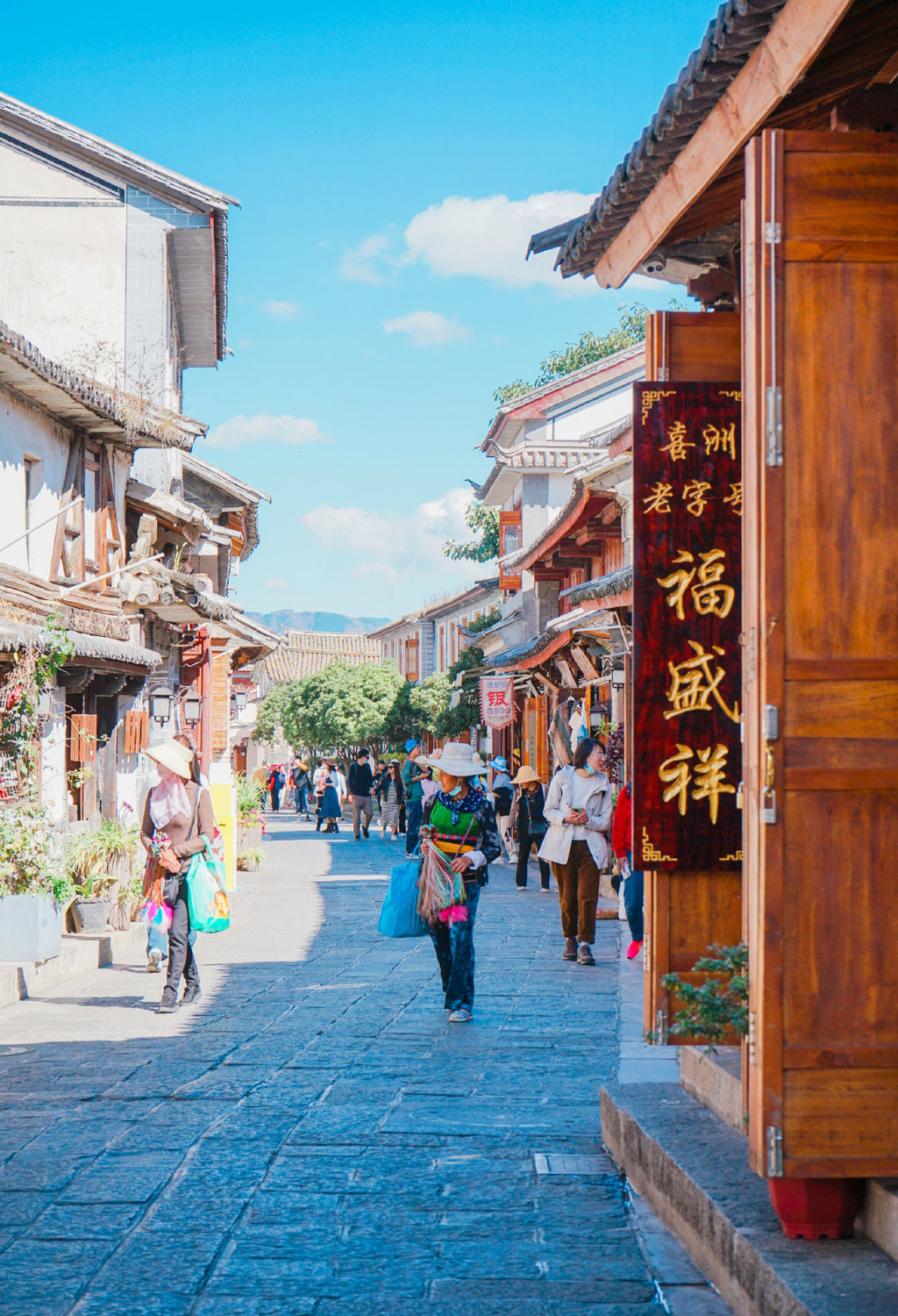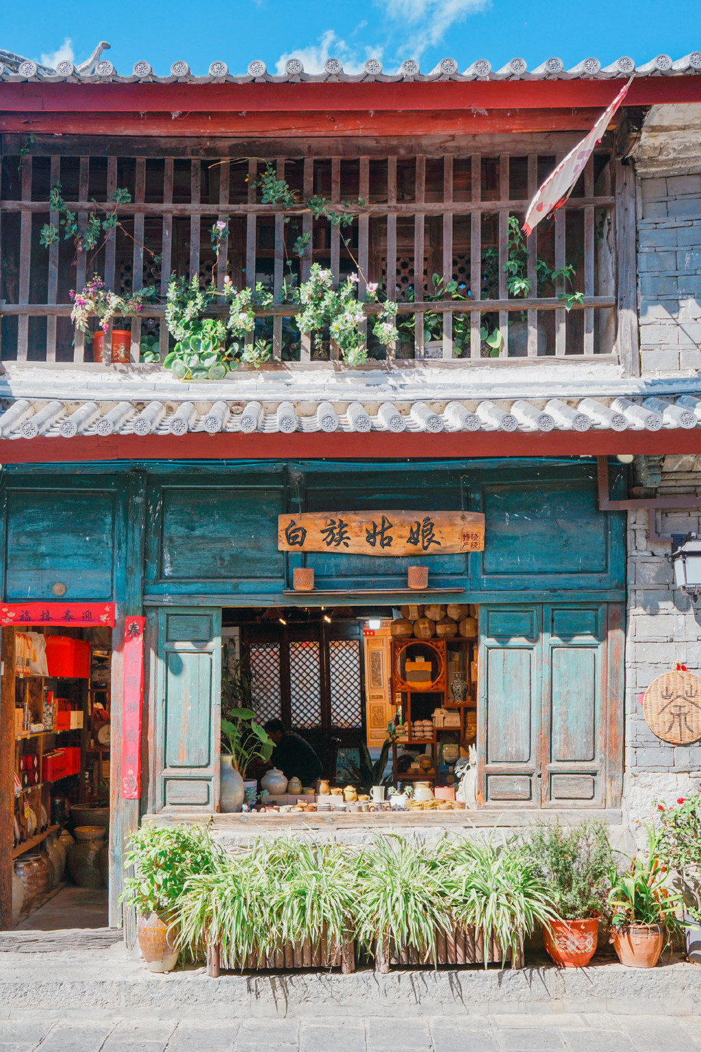 迎着和煦的阳光,古街两旁的店铺次第在阳光里开始了一天的营生。米线店、咖啡店、古董店、刺绣坊、杂货铺,剃头店,客栈……吱呀一声打开木门,迎来暖洋洋的阳光。这些临街的小店是古街鲜活风景的生命元素,一道道古旧的门面里藏着曾经的光阴,檐下挂满的扎染制品里晕满草色的苍翠,店家悠然的清理着铺面,偶尔和过路的行人亲热地打声招呼,或是就着篾桌草墩坐在店铺前慵懒地享受古城上空温暖的阳光。