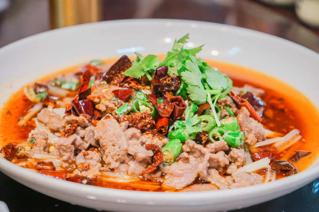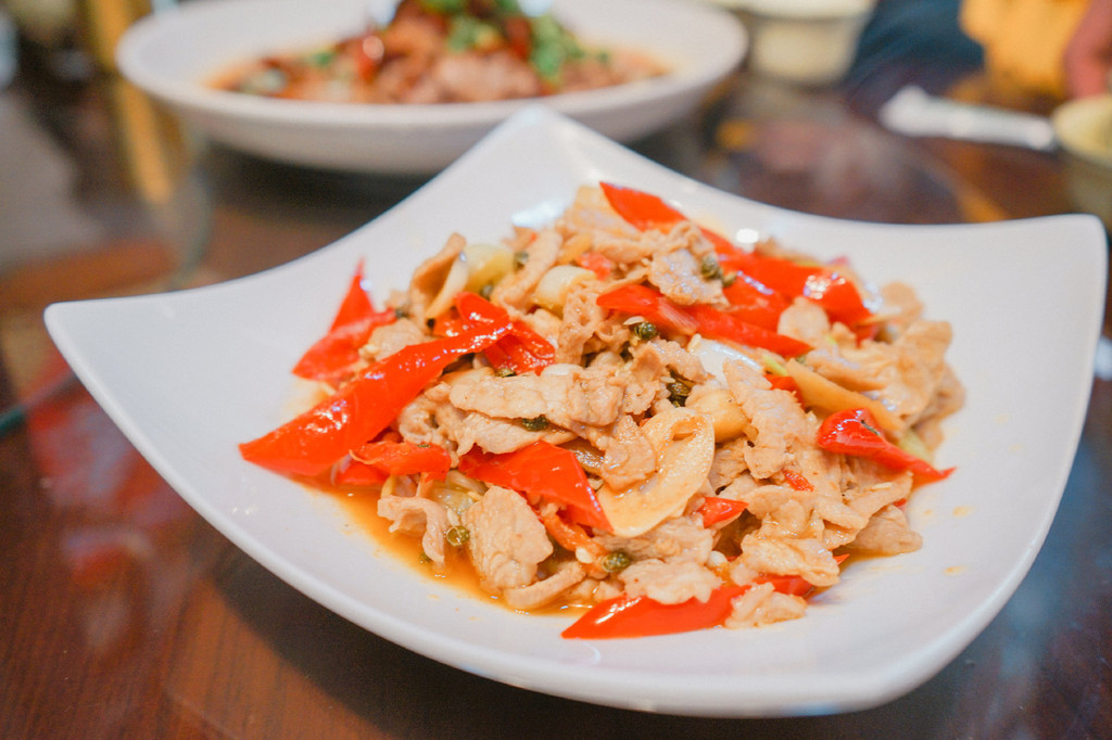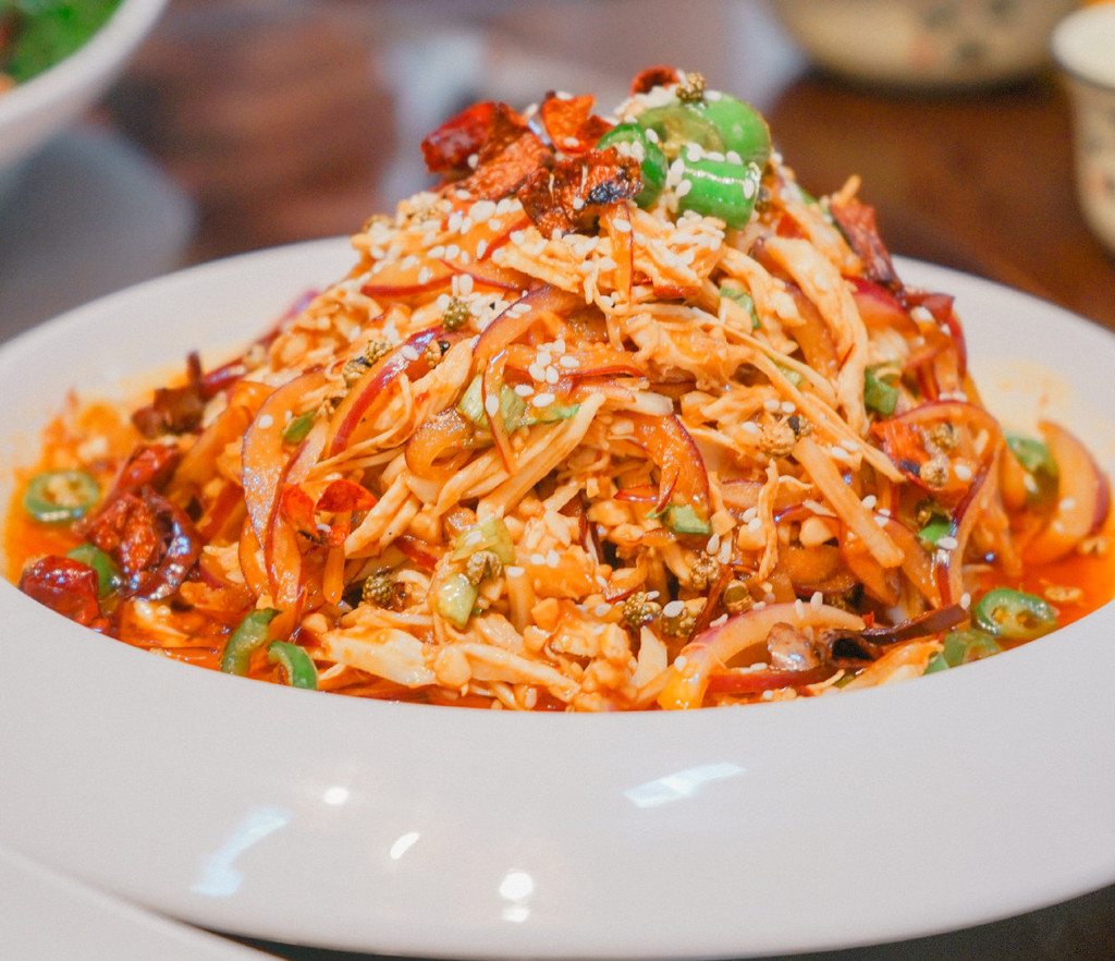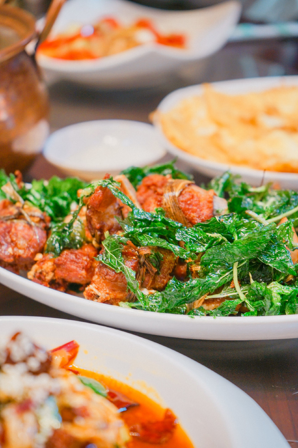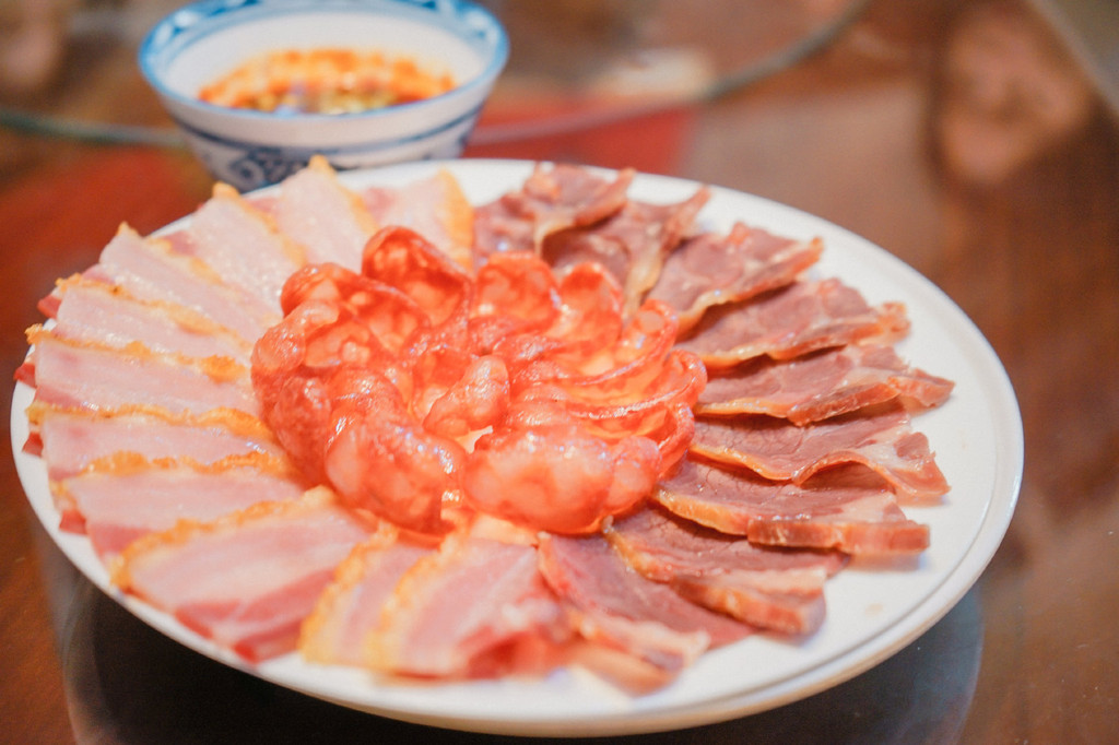 餐厅开在一所老宅子里,房屋建筑很有特点,茄丁、酸辣里筋、素鸡块、网油焦肝、巍山雪花牛肉、黑松露炒土鸡蛋、腊肉香肠、饵块、白菜球球。