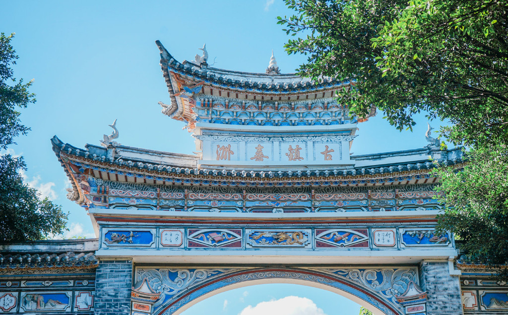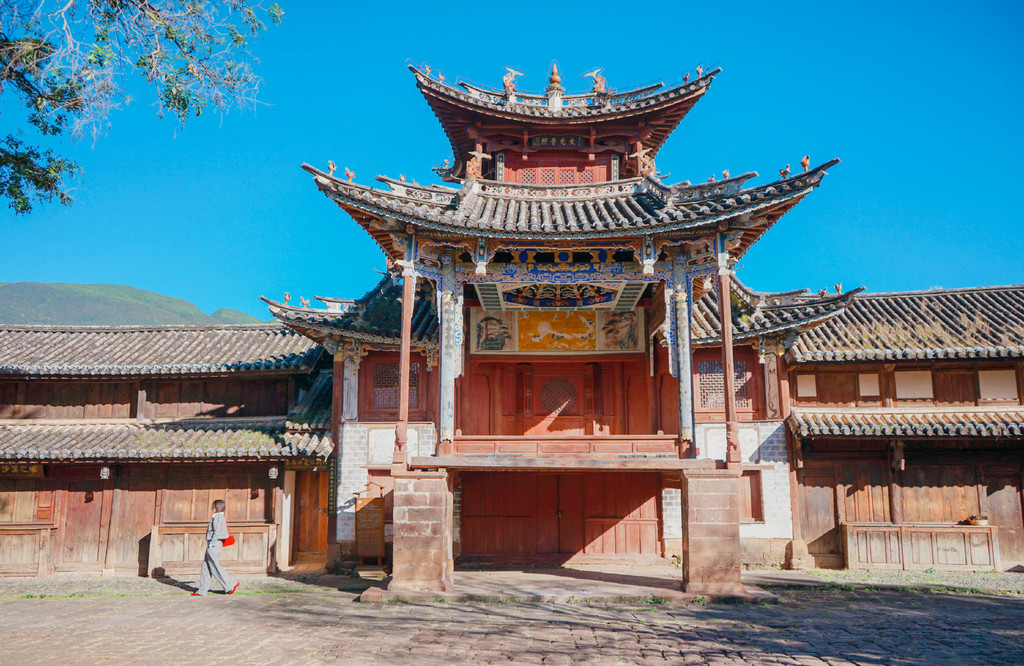 古戏台,建于清嘉庆年间,共分三层,底层是商铺,中层是戏台,三层为供奉魁星的魁星阁,每逢民族节日,全镇的白族人民便到古戏台上载歌载舞,最热闹的莫过于每年农历二月八的太子会。