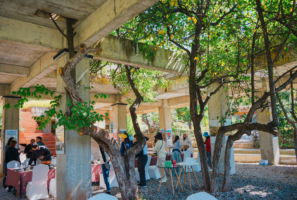 空中稻田是凤羽著名的奇观,把秧苗插到屋顶上。在这个下沉式的公共空间,一排排的古梨树继续向阳野性生长,天、地、建筑形成了和谐的构图,这里静谧、质朴,可谓是人们的精神故乡。剧场是整体结构为钢筋水泥的一层建筑,三面无墙体,一面与山坡衔接,屋顶种植了水稻。沿着台阶行走至下层,漫步于架空的建筑里,仿佛时空交错。