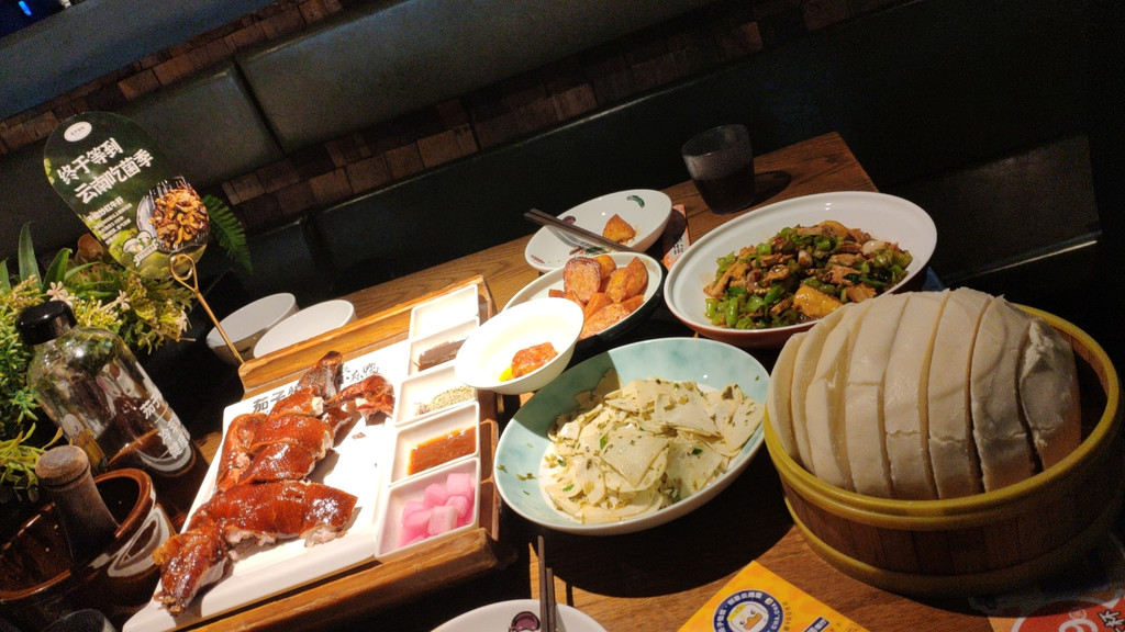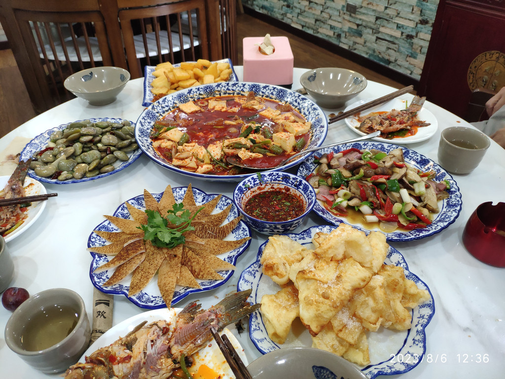 砂锅鱼+雕梅蒸排骨,前者就不用说了,料非常的足,鱼又鲜又嫩又入味,配菜也好吃,鱼汤更是美味。后面这个雕梅蒸排骨给我的印象真是太深刻了,以至于都没找到一张特写照片(下图左下角),头一口:味道怪怪的,是不是坏掉了……第二口:咦,挺香,甜不甜咸不咸的,还挺上头,然后就一发不可收拾了,一口气给干完了,以至于回到大理古城就去买雕梅带回家了。
