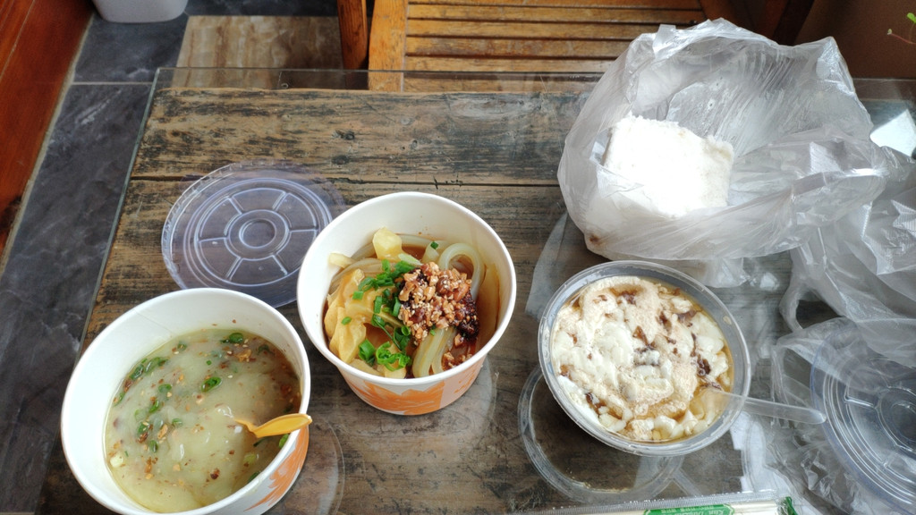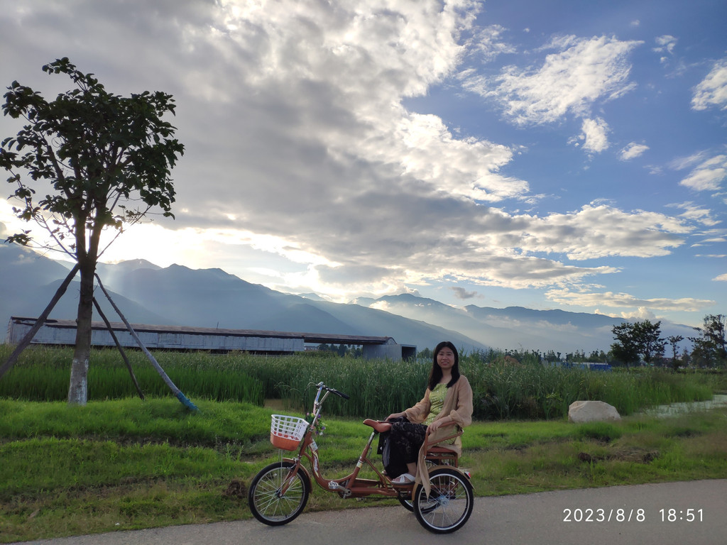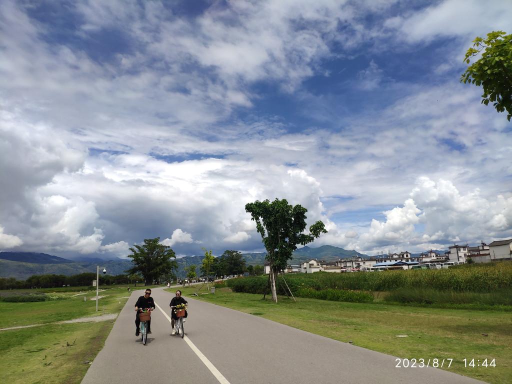 先把早饭解决,这些都是在菜市场附近买的,味道都还不错,我们属于随意行,一般都要睡到10点才起床,其实叫中午饭也可以……吃完出发,租了个电瓶车骑到生态廊道旁,电瓶车是20元一小时,喜洲骑过去也就20分钟吧,古人名曰路上的风景才是最美的,诚不欺我。