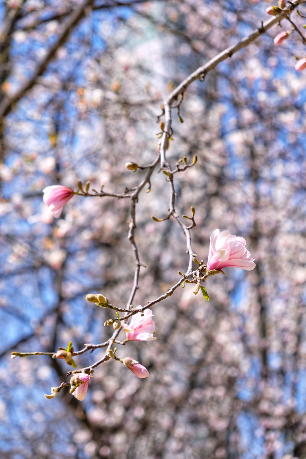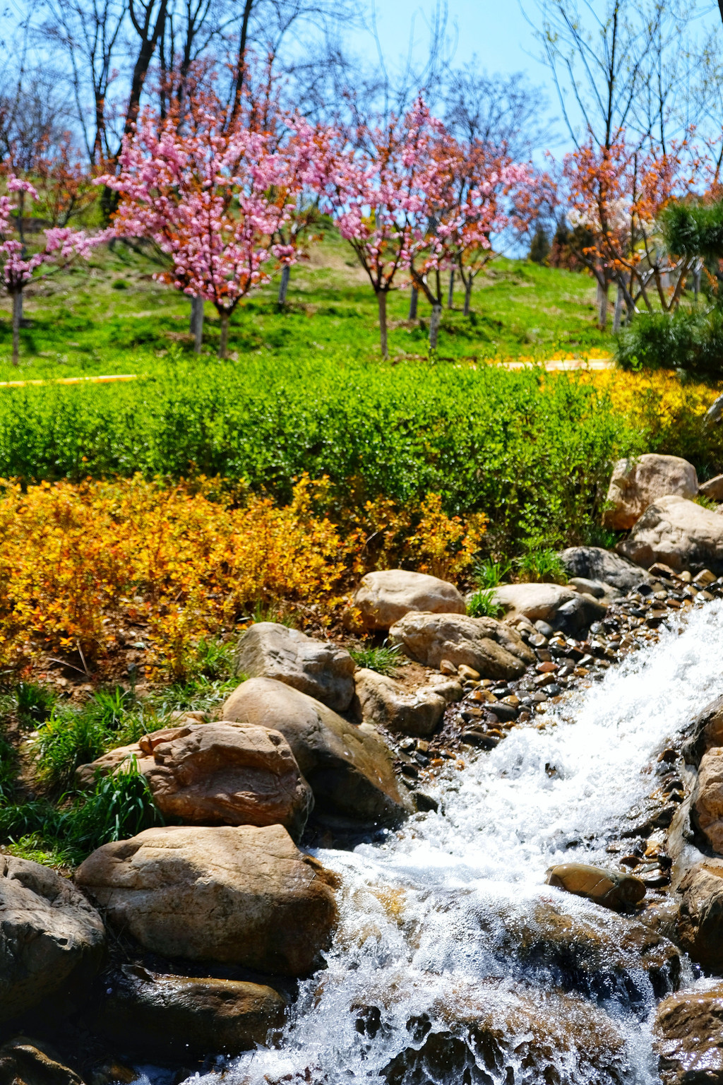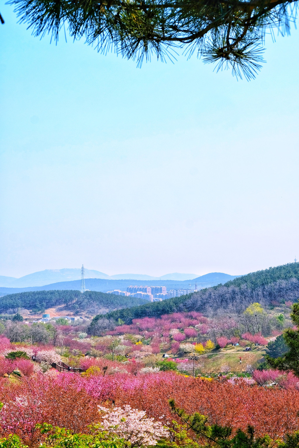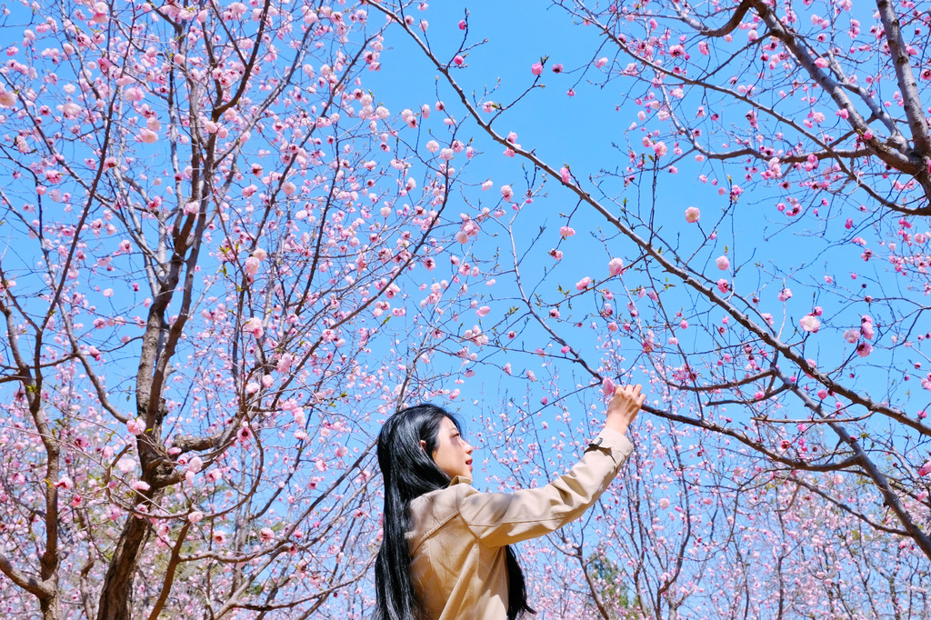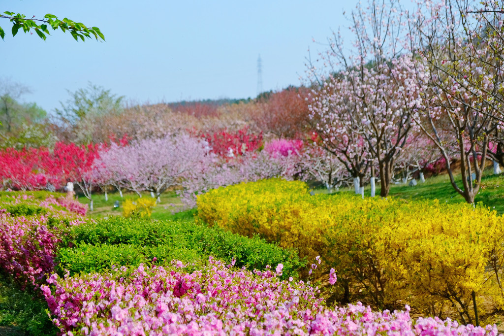 樱花园里不只有樱花,花的种类超出期待,樱花、梅花、玉兰花、迎春花,还有很多叫不上名字的花,每一种花还有多种不同的造型。一定要走到园区的高处向下看,是一片色彩斑斓的花海,仿佛世外桃源。