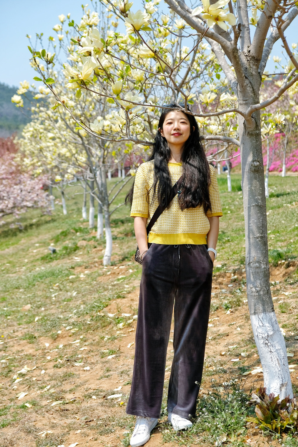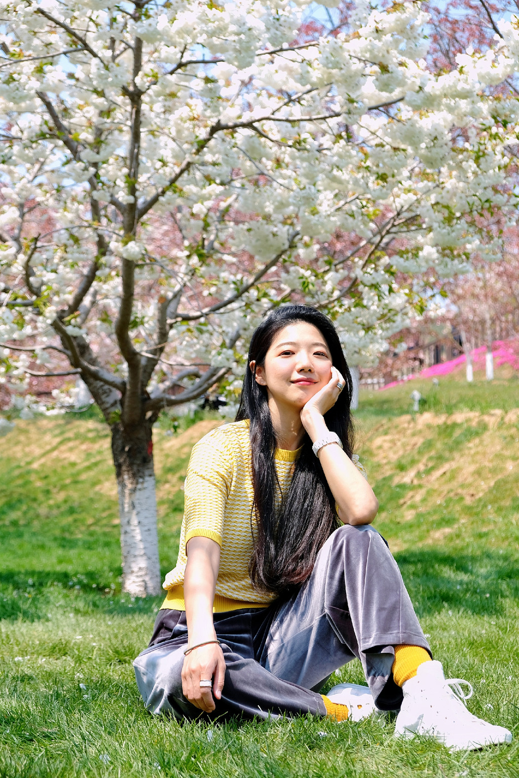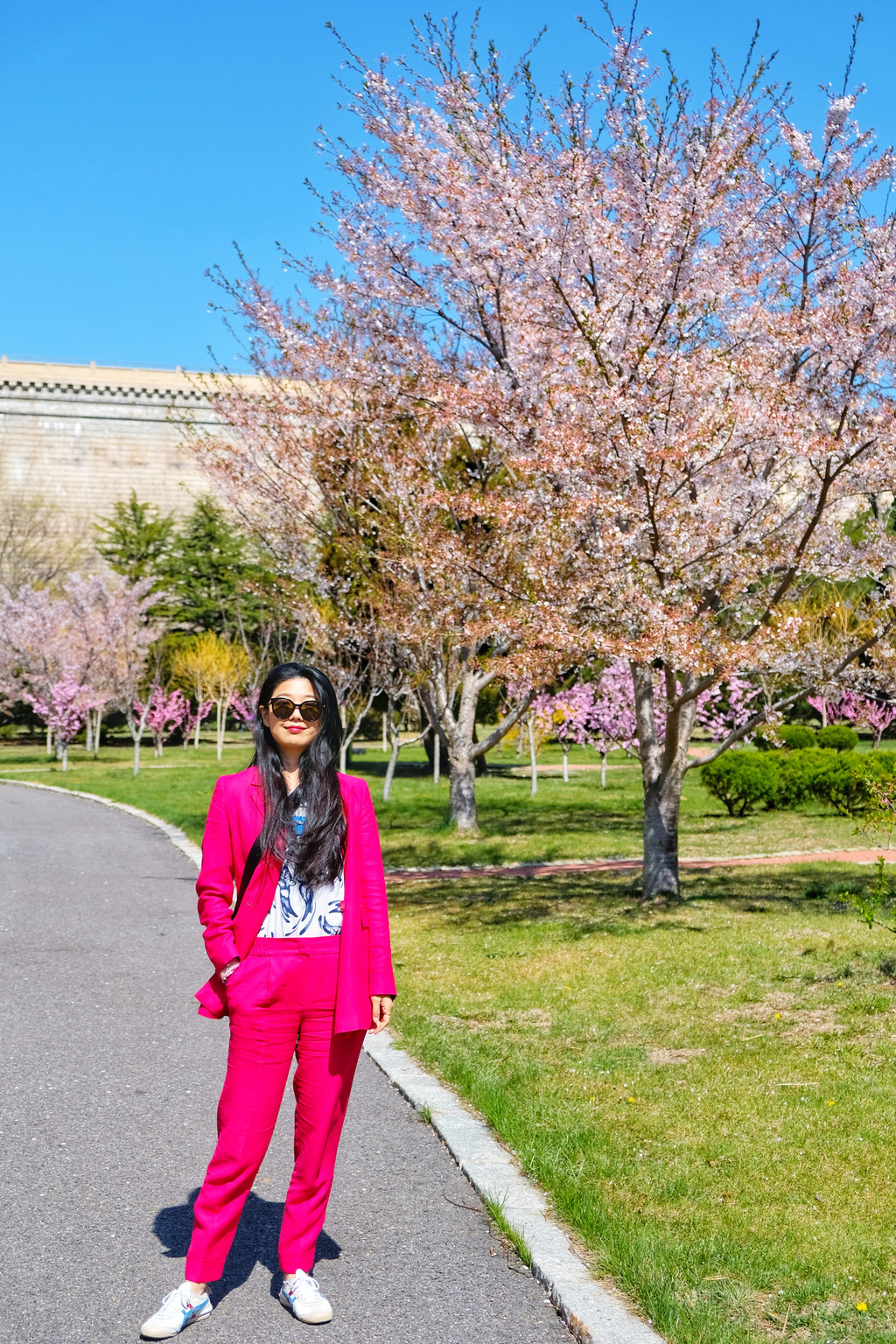 我穿了一套玫粉色的休闲装,大概是觉得樱花太好看,一定要穿的颜色比樱花还要鲜艳,才能在樱花丛中抢到些戏份。
