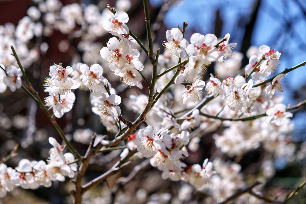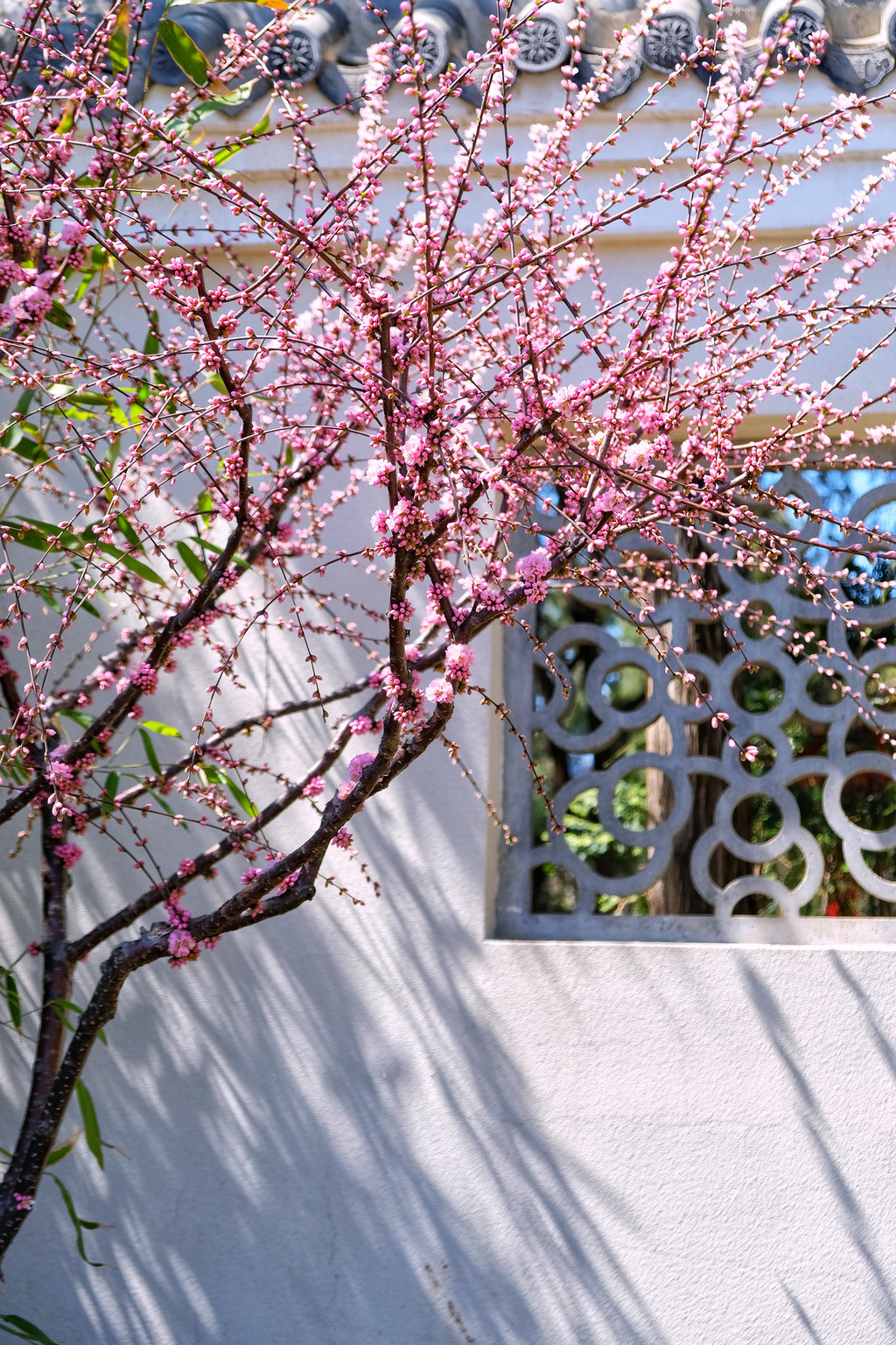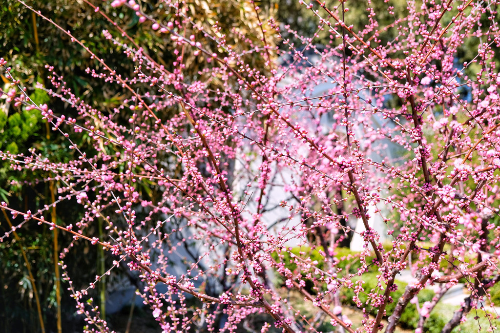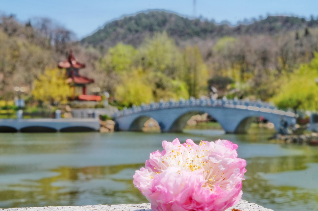 桃花和迎春花也开了不少,开在中式的凉亭旁,日式的院落里。在公园里随便转转,都能看到一些美好的角落。