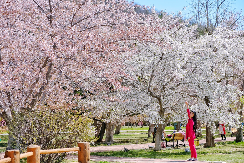 旅顺樱花园是目前国内园区面积大、樱花树多、品种最全的樱花园,有来自世界各地100多个品种3000多棵樱花树。园区的规划也很好,动线很顺畅,顺着路线一直走,就可以穿过不同颜色的树林和花丛,像穿过一个超大的调色盘,沿途时不时有一些搭配樱花设计的景观, 比如中式的仙鹤雕塑搭配樱花,日式的阁楼栈道搭配樱花,让景色很丰富。