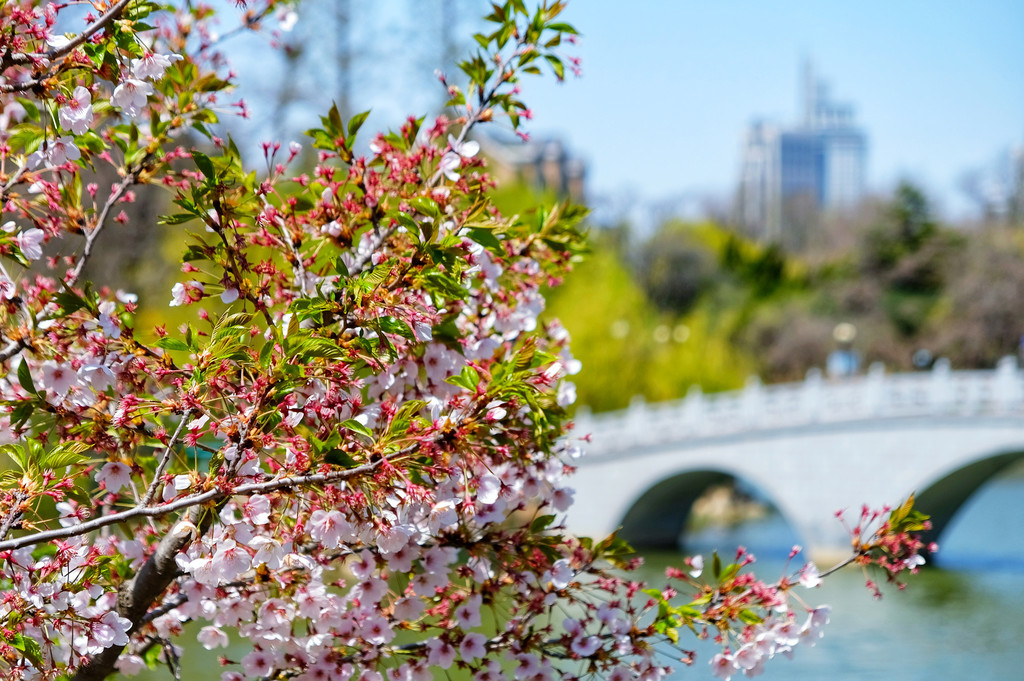 园区被一座堤坝分成两部分,中间有一座木桥连接,走过木桥,看着成片的樱花沿着堤坝开得茂盛,每每有风吹过,都有很多花瓣飞起又落下,是“十万樱花入梦来”的意境。