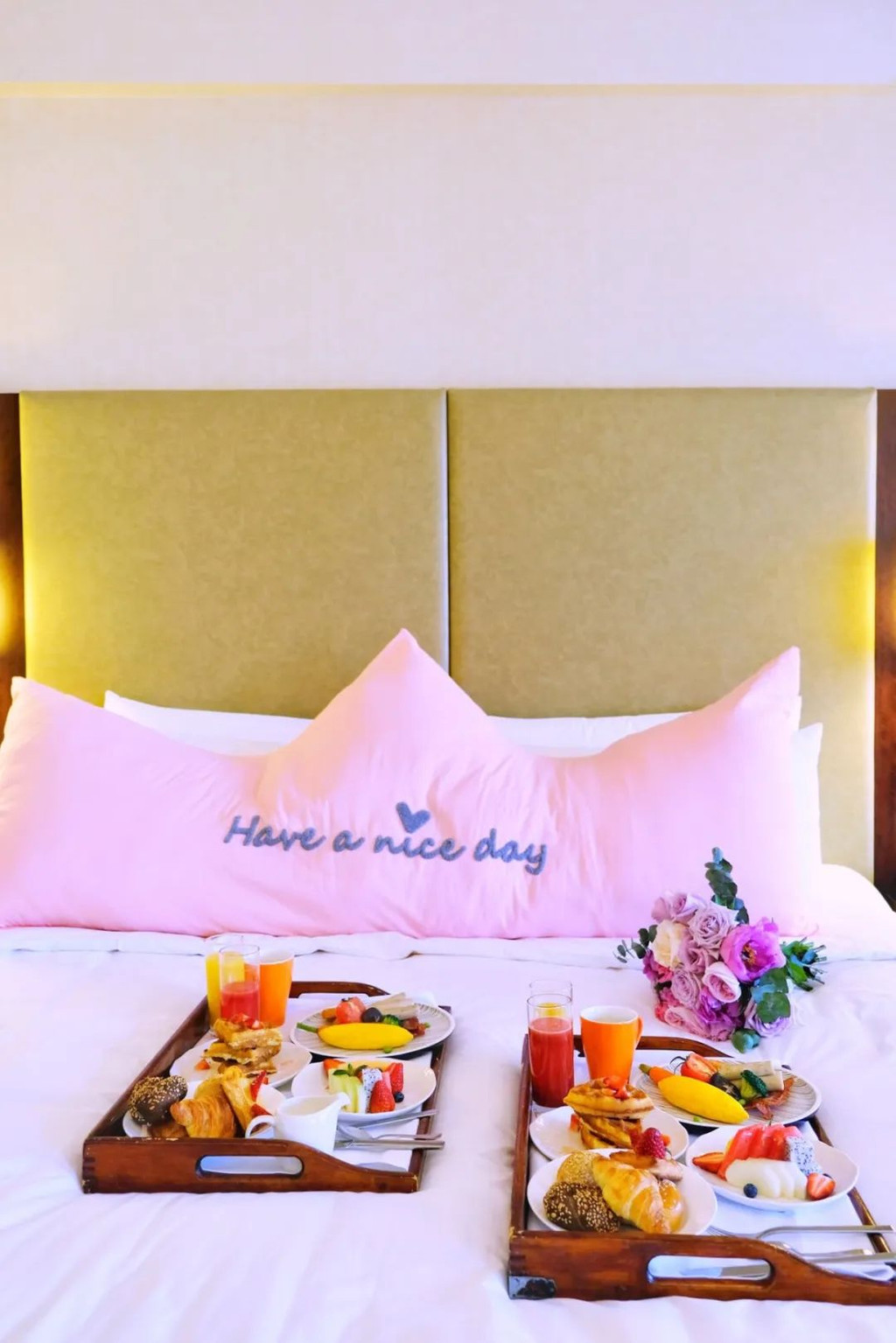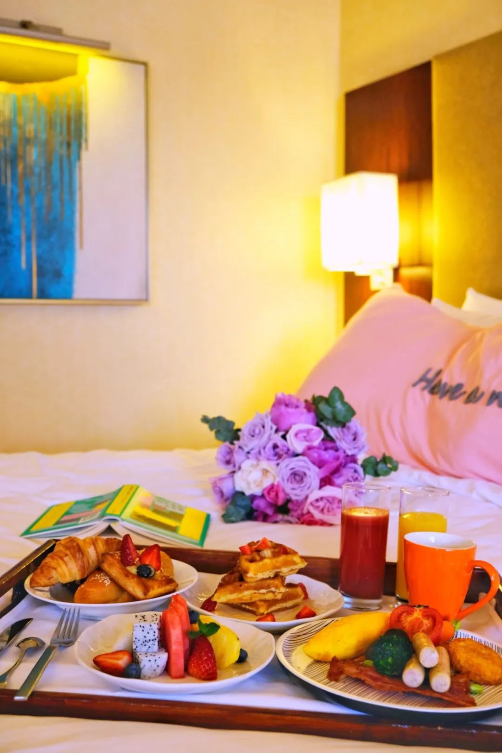 酒店最近有可以在房间享用的双人早餐,服务员会在约定的时间送到房间来,可以尽量减少接触。早餐实在太丰盛,颜色搭配很好看,推进房间我的第一反应就是“诶?这不是给我上了一份ins道具么”!