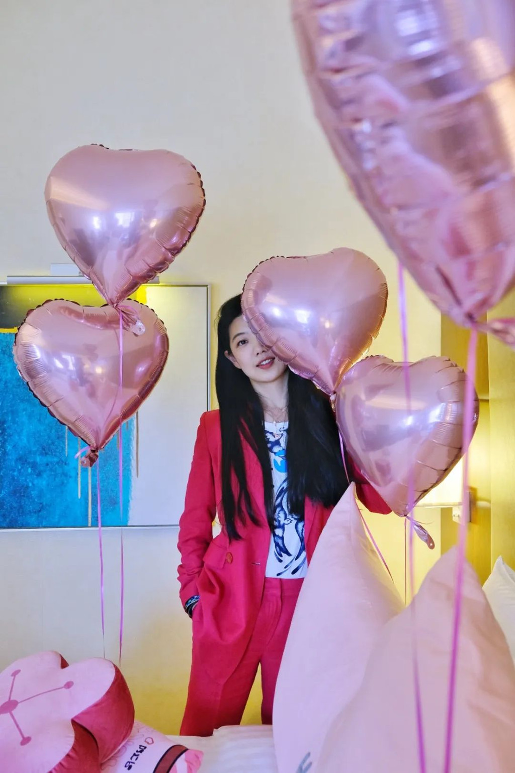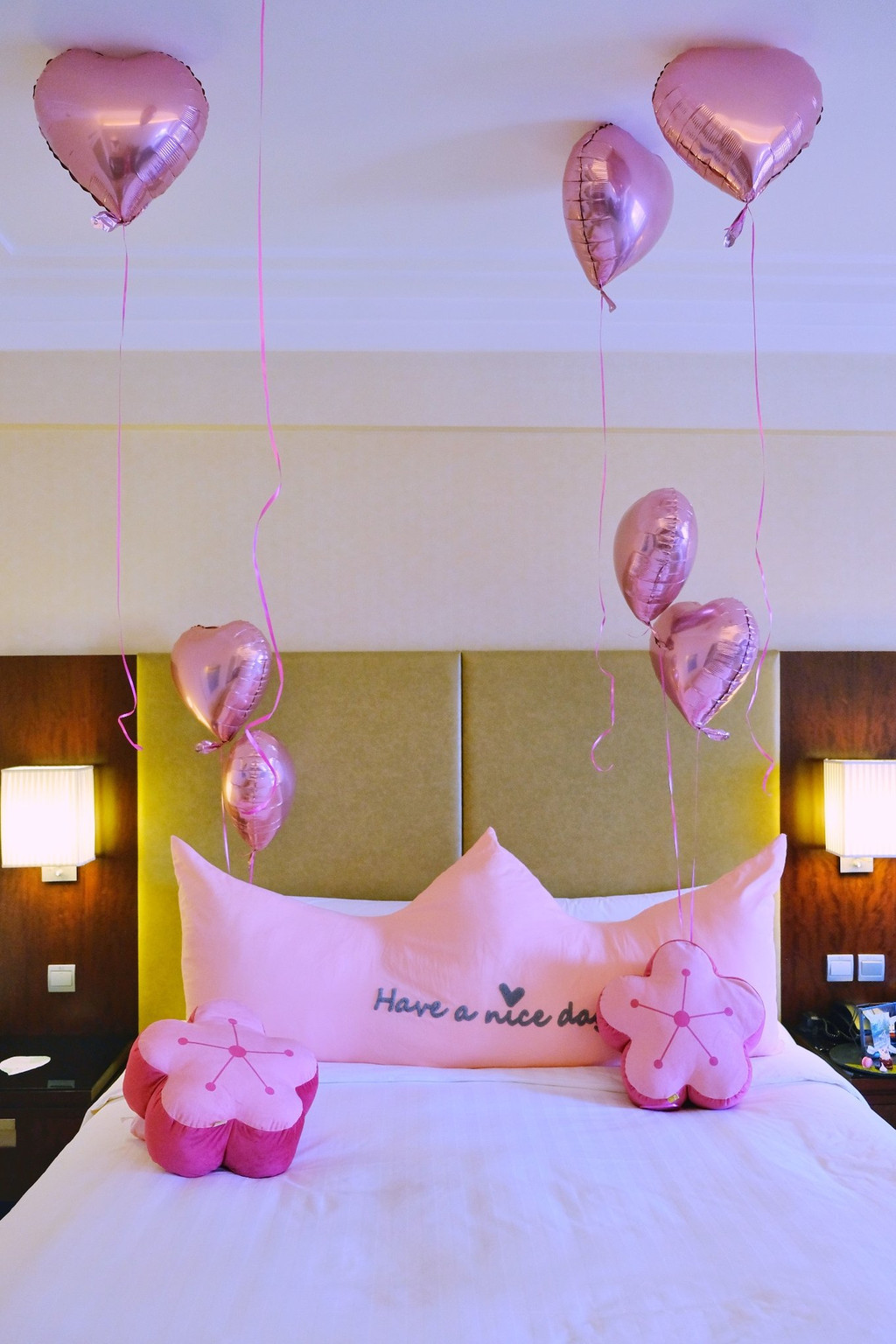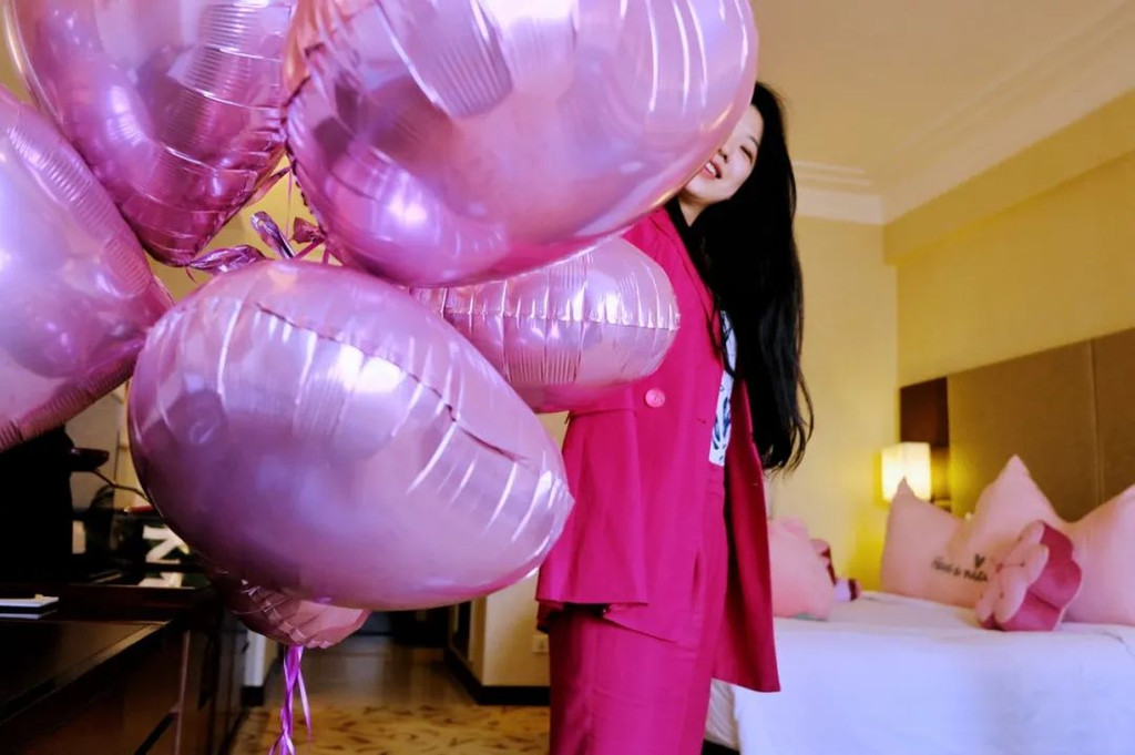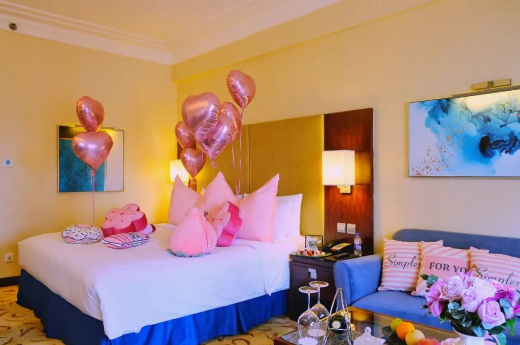 桃粉色的气球飘在房间,淡粉色的樱花抱枕轻放在床头,床边还有一双粉色的毛绒拖鞋,浅粉的英式三层 塔下 午茶摆在茶几上,旁边是一束粉色紫色搭配的花,我穿了一身玫粉色的衣服,一打开房门,全都是春天的气息~