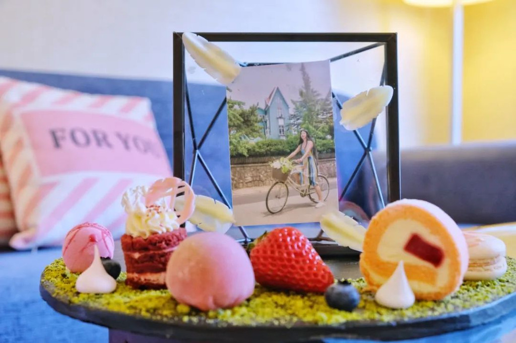 看到茶几上放着欢迎甜品,上面竟然有我三年前的照片,那时候还是给 青岛 香格里拉 做宣传片的演员,照片是拍摄的场景之一,全都是回忆,太贴心,惊喜!