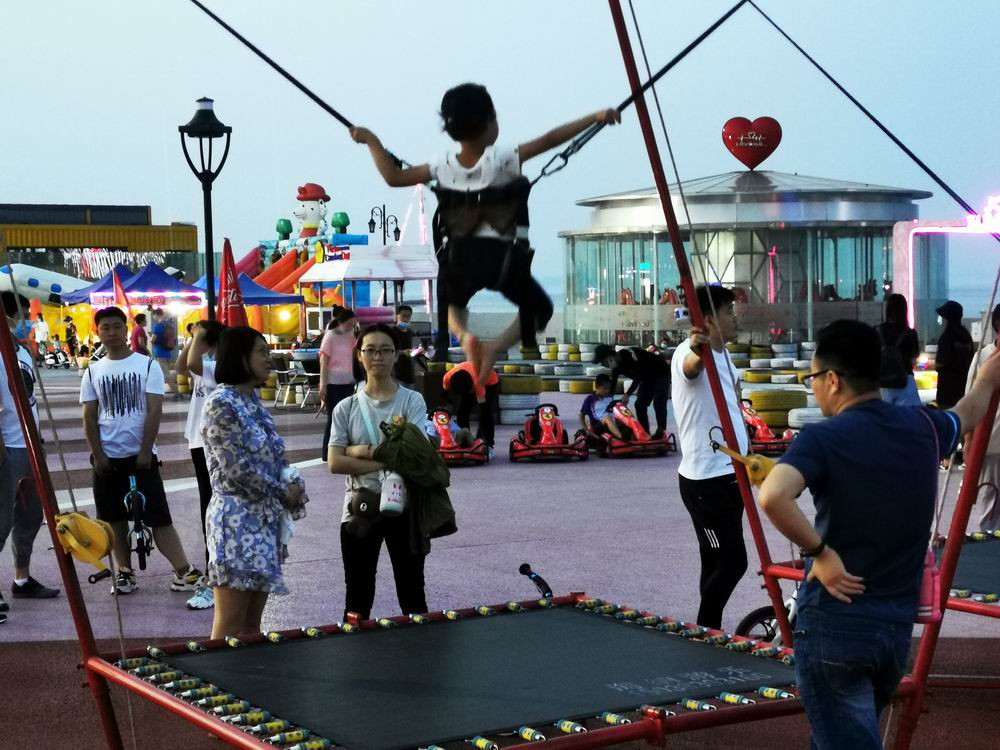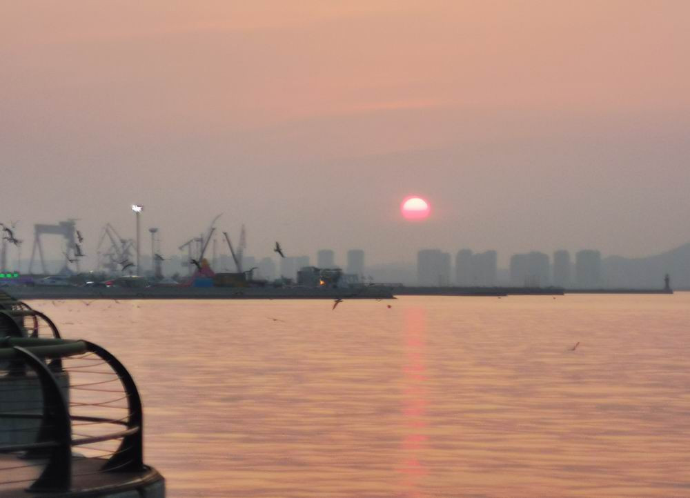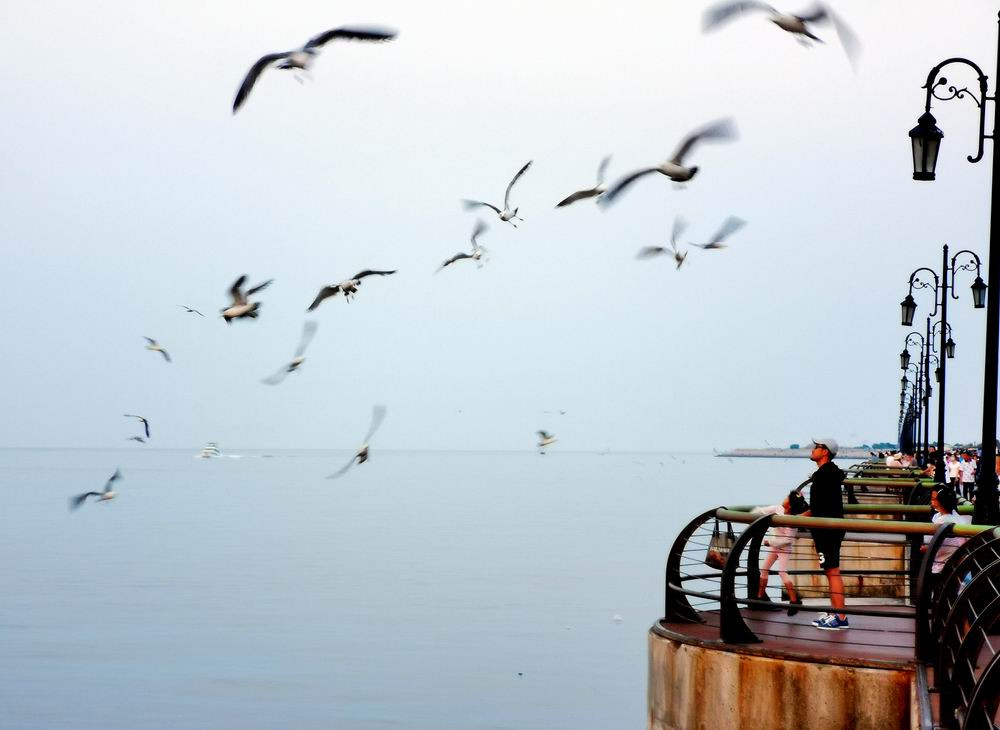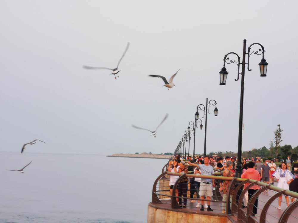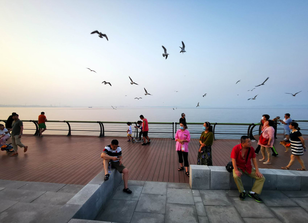 傍晚的的东海广场木栈道,空气清新。很多人扶栏观海,与海鸥共舞。