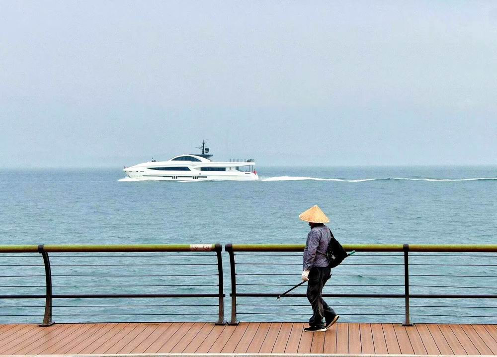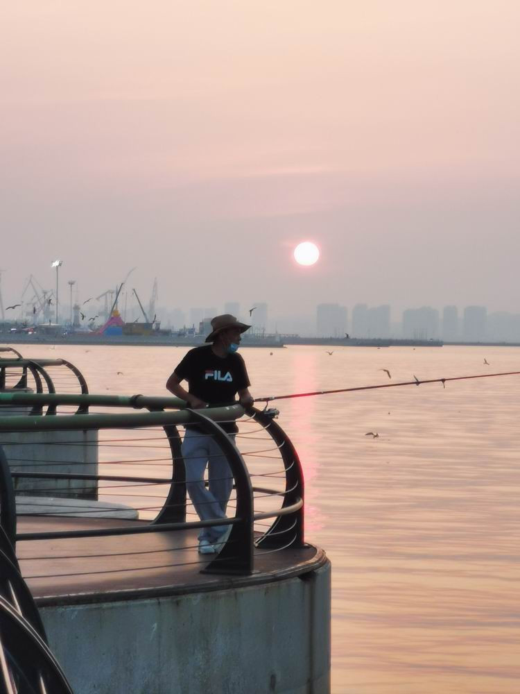 傍晚的的东海广场木栈道旁,有人在钓鱼。