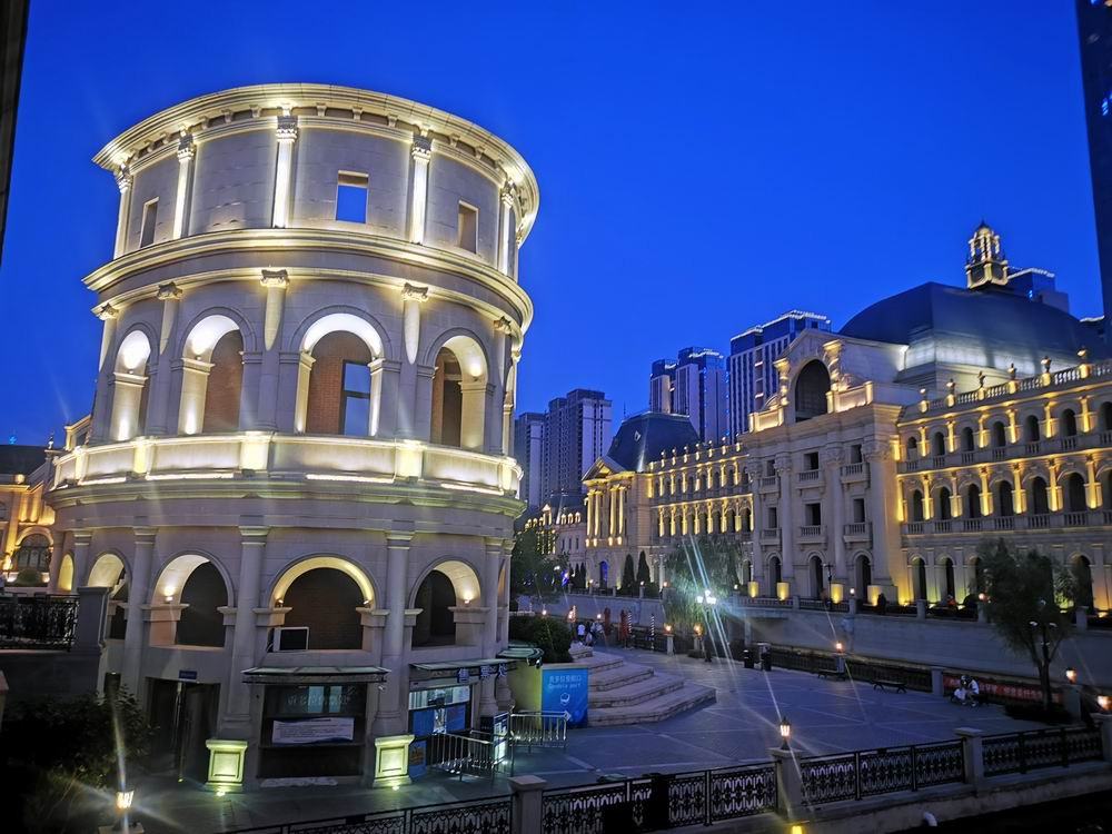 东方水城位于大连东港商务区。这里原来是大连港的货运码头。码头搬迁后,这里经过填海造地,改建成东港商务区。图为东方水城外面广场上跳广场舞的大妈。