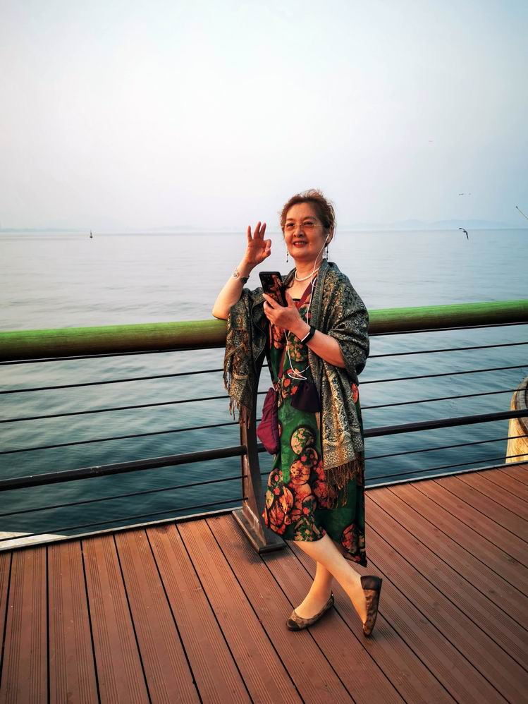 东海广场靠海的一侧,建有木栈道。图为夫人在木栈道上拍的纪念照。