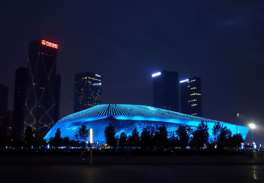 大连东港商务区包括大连国际会议中心、东方水城、国际游艇俱乐部游艇码头、凯丹广场和东海广场等。大连国际会议中心是大连新的会议中心,近些年的夏季达沃斯会议都在这里举办。图为夜幕中的大连国际会议中心。