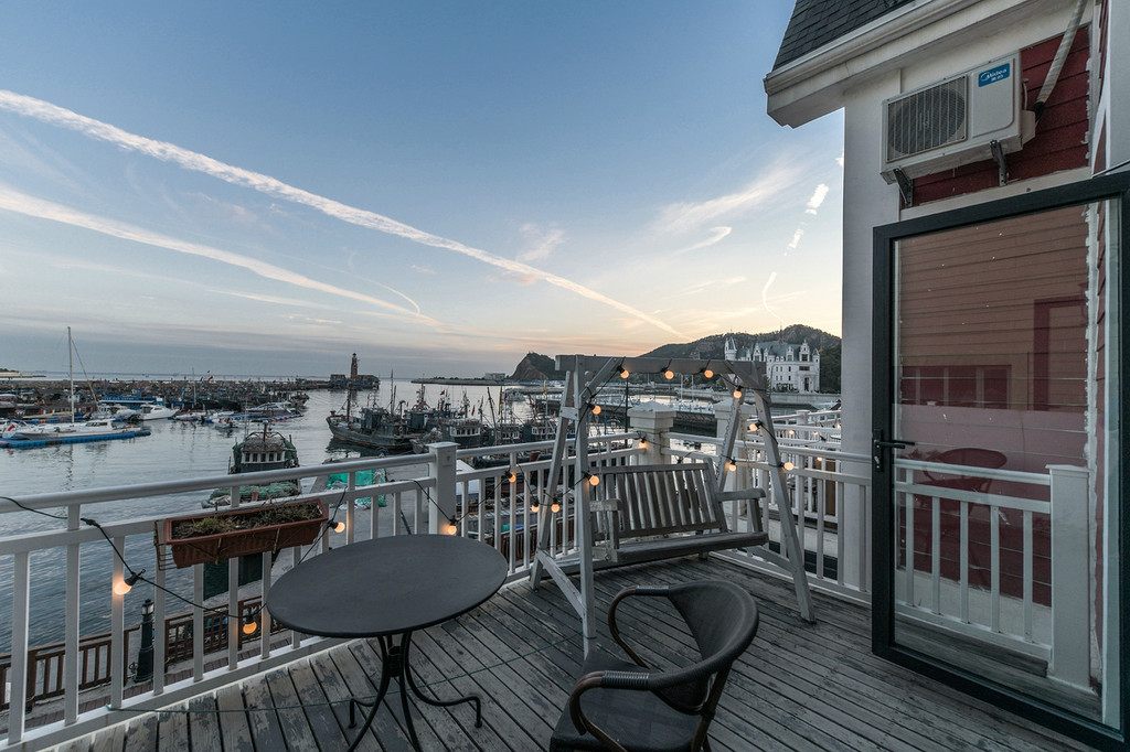 客房的一半朝向码头,在阳台上可以欣赏海天一线的海景,太壮观了!这才是真正意义上的海景民宿。这么好的观景视角、装修别致、格调也很高雅的民宿,怎能不吸引人们到此小住几日呢?否则当前偶像剧明星也不会到此打卡了,对吧?