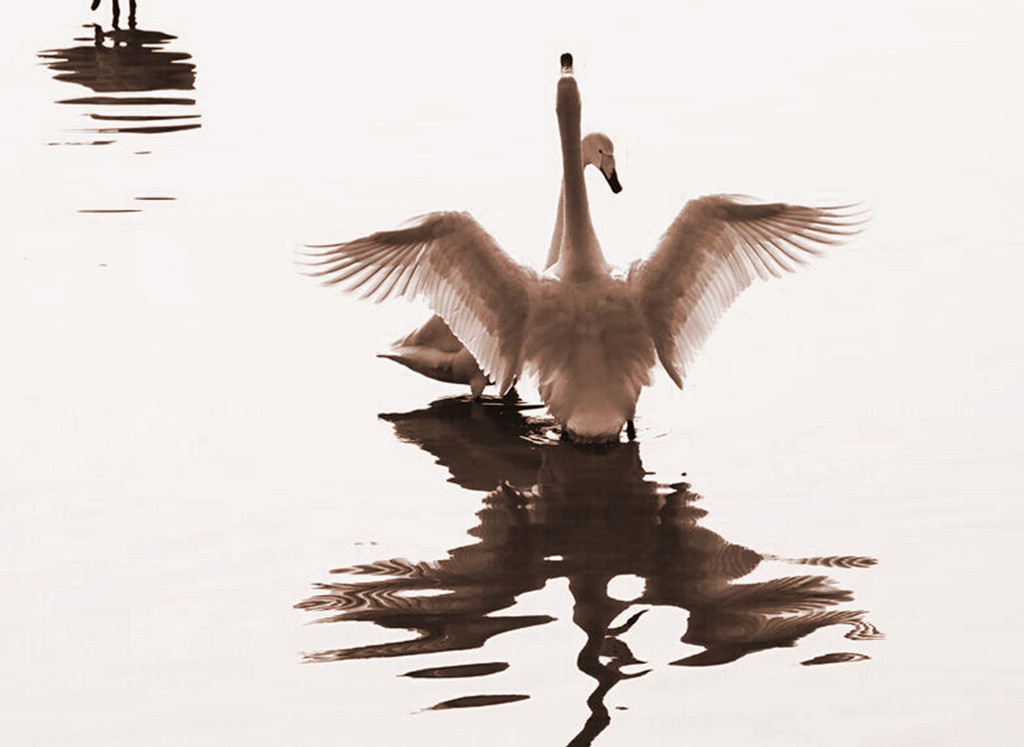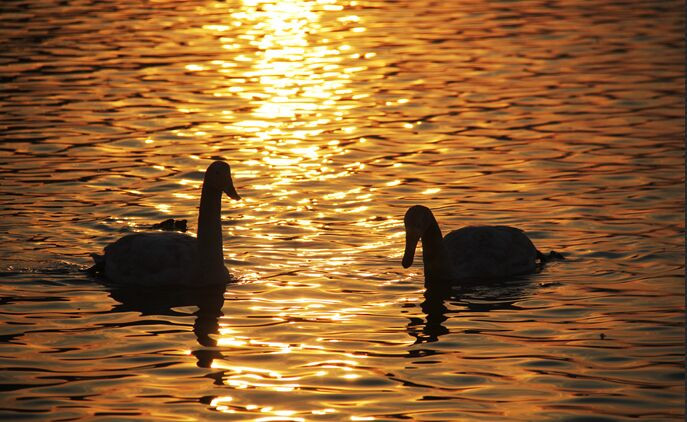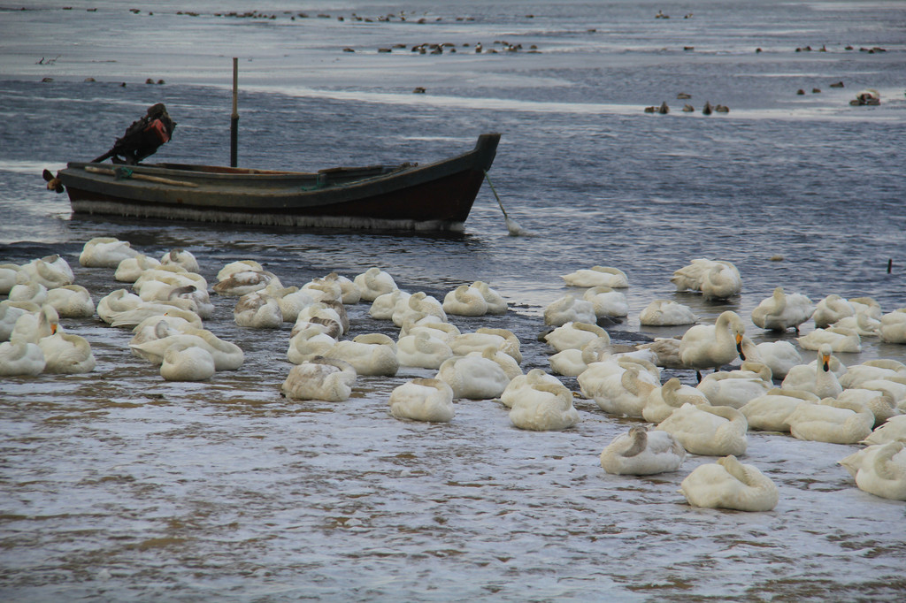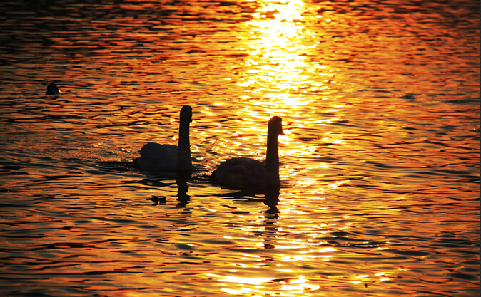 一下船,直奔烟墩角,果不其然,朝霞中,天鹅早已经晨起多时了。见过大世面的天鹅,并没有因为我们的激动而改变“猫冬”日程,该吃的吃,该喝的喝,吵闹起来,丝毫没有银幕上那种高雅、优美的大家风范,你争我抢中,惹得岸边发烧友长枪短炮的一通“狂轰滥炸”。
