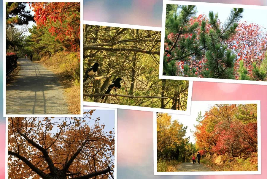 顺着山路拾阶而上,呵呵,景色不错啊!山路蜿蜒曲长,树叶红绿相间,人们三三两两的,穿红戴绿的,赤膊光腿的,领孩牵狗的,山上山下晃悠着。