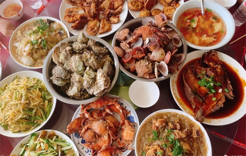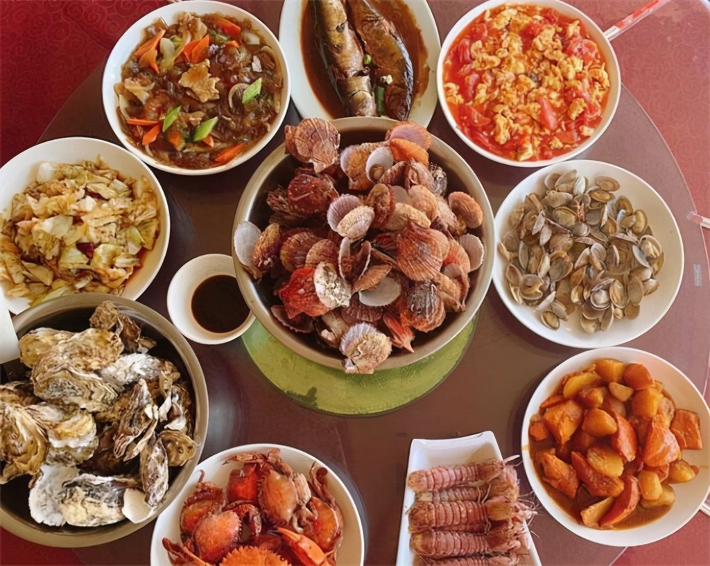 蛤蜊、扇贝、梭蟹、鲅鱼、黄花鱼, 春夏季是吃海鲜的季节,而秋季正是海蟹肥美的时节,名菜大多与海鲜有关,除了煎炒,常见的吃法是清蒸或者清水煮。