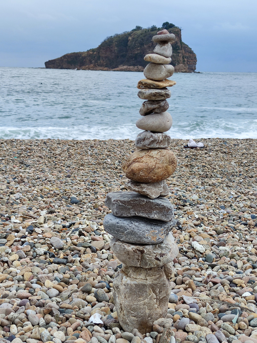 进入棒棰岛宾馆风景区(门票20元),入口处有人会引导你去往其它地方游玩,比如坐船游玩海岛,不要理会便是。途径几处公馆,抵达海边卵石海滩,几多游客在此戏水。该海域属于黄海,水色清澈。海滩对面有一座石岛,从外形一眼便得知何谓棒棰岛。望海发呆之余,我和太太在海边玩起了堆叠卵石的游戏。
