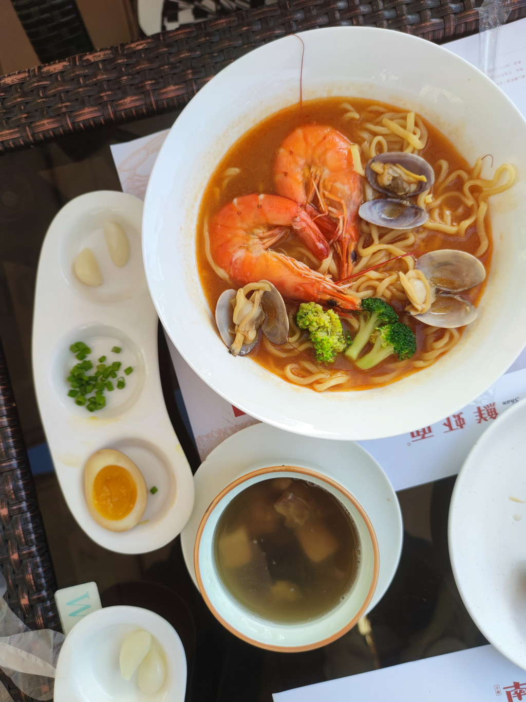 中午回到会议中心,在附近东方水城吃南山鲜虾面,48元一碗汤面加两只大虾还有糖心蛋,汤汁鲜美,实惠之至。餐后在就近海岸周游,看岸边喂海鸥美女歌唱直播。晚上在凯丹商场4楼吃广式茶餐厅,味道纯正,饭后到会议中心观看音乐喷泉,预祝国庆。