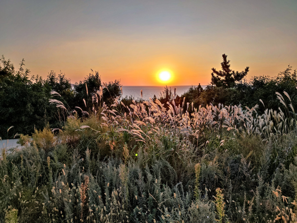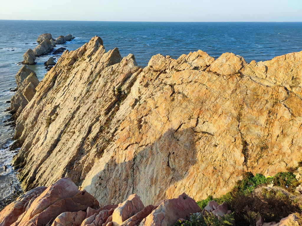随后到排石景观,路边停车,景区免费。徒步顺着相对平坦的道路走近海岸线,忽遇面前岩壁陡然塌落,原来我们所站之处乃是高出海平面数十米的岩石高台,如同犄角一般探入大海。眼前一块倾斜的巨大山岩自海中刺向天穹,大有谁与争锋之英雄气概。岩壁似乎触手可及,又似乎遥不可及,其后还有一排海中独立的山岩,照例突兀尖刺向天,如大山岩之徒子徒孙,直至没入海中。受海水侵蚀所致,高台边沿均是垂直岩壁,冒险靠近,窥视底下滔滔海浪拍击山岩,不免心旌摇动,脚步虚浮如被牵引,乃急退数步,方觉心安。此时斜阳西下,海水熔金,红霞映照山岩,壮阔无边。景区附近多有卖红薯和玉米的小摊,应是当地特产。