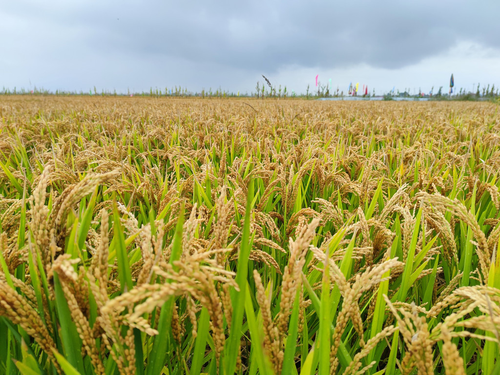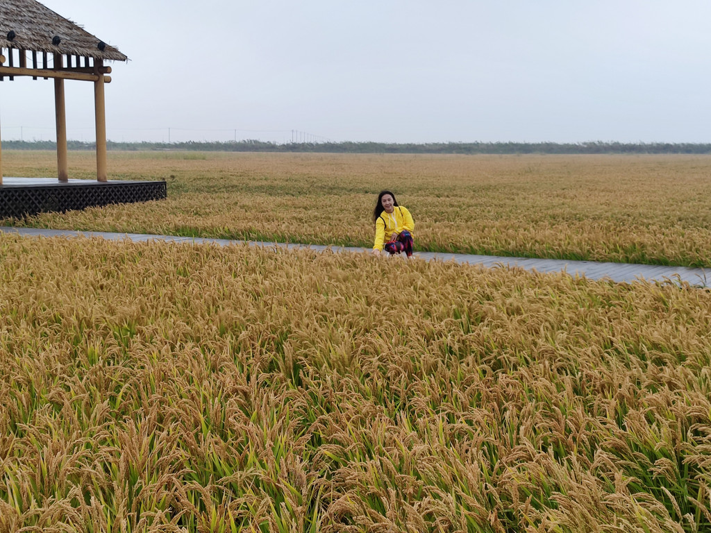 乘坐小列车进入红海滩,前面一、二站下车观景,从第三站开始,便是乌云翻滚,继而滂沱大雨借着横风扑面扫来,我们车厢面风的一侧完全是敞开的,任凭风雨肆虐,车内游客纷纷打开雨伞顶住风雨,惜首尾不能相顾,继而雨水浸润长凳,情形狼狈,到站下车观景之意荡然无存。到达南门后,风雨稍怠,于是我们直接坐回头车,在第二站(南门往北门方向)下车,此处红海滩接天连海,开阔无边,红草团团蔟簇,形同铺开红地毯,以迎接天帝临凡。而一路之隔,便是同样一眼看不到边的金黄色水稻田,顺栈道走进水稻田,看到水稻颗粒饱满,沉甸甸一大串缀满植株,不禁用手轻轻爱抚,体察天地之恩情,日月之美善。